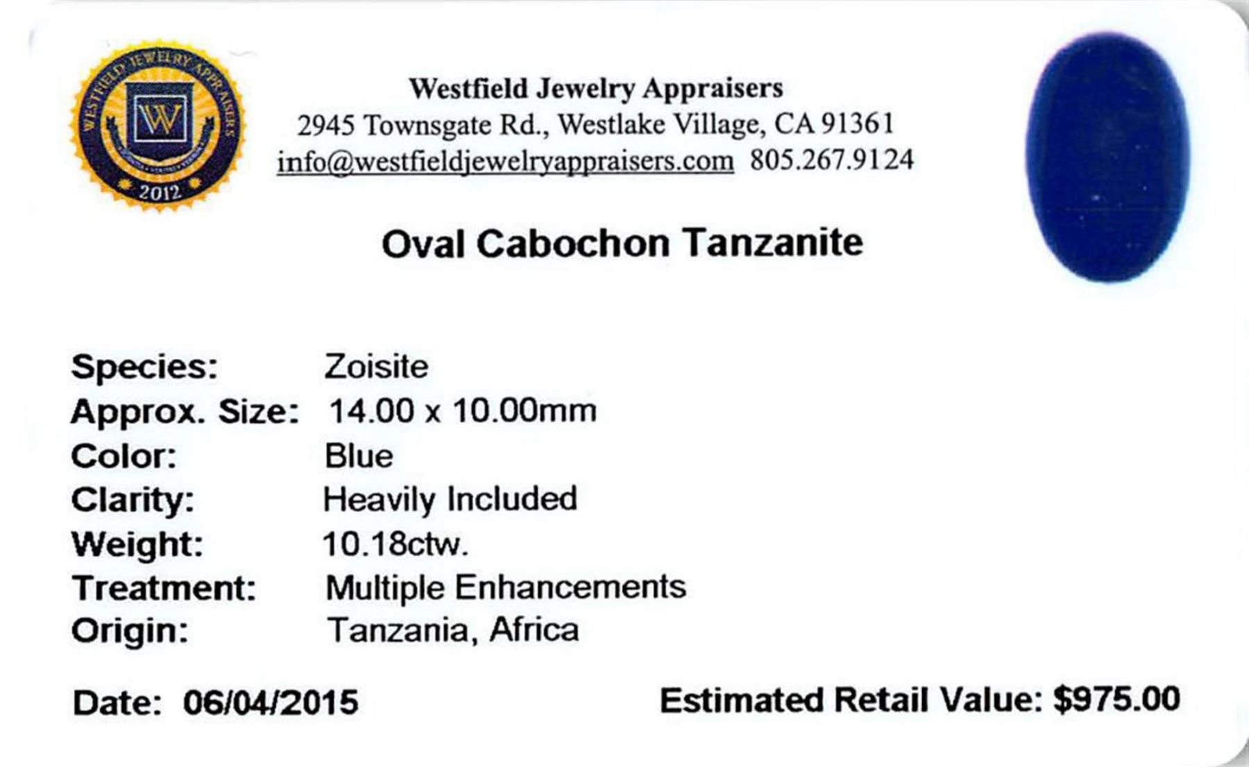 One oval cabochon cut tanzanite, measuring 15.00 x 10.00 x 7.00mm, exact weight 10.18ct., clarity is heavily included, type I, dark, moderately strong, blue color, (GIA B 7/4), cut is good. Transmitting light somewhat diffusely, transparent to translucent. Naturally occurring internal & external characteristics are present. Indications of heat treatment. Westfield Appraised.