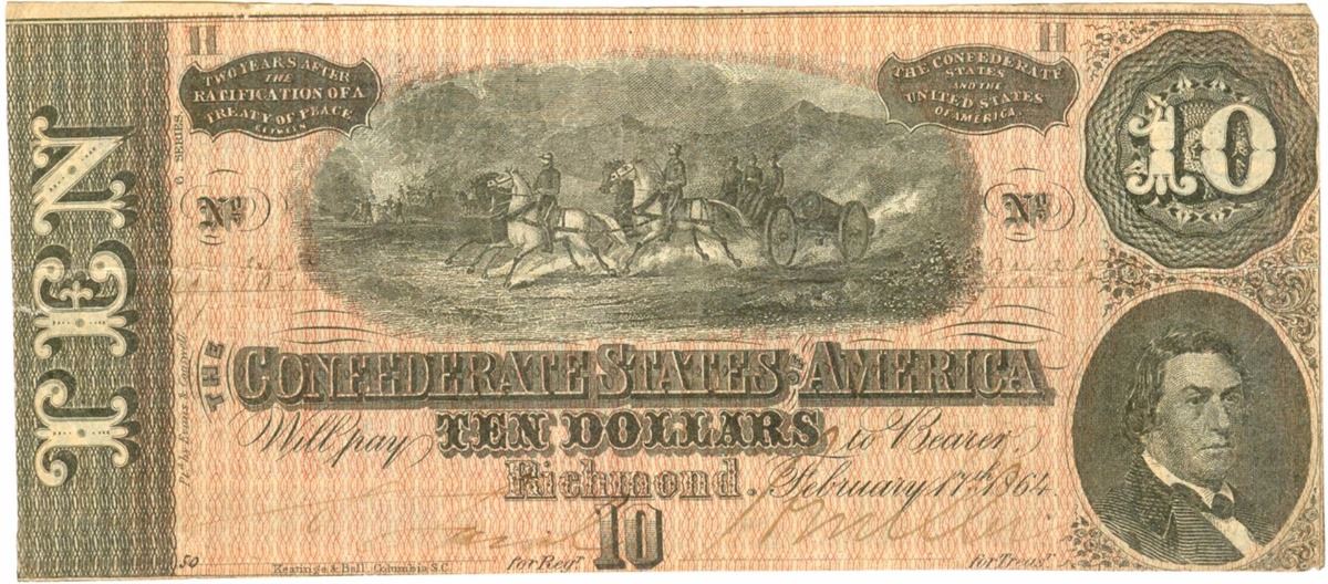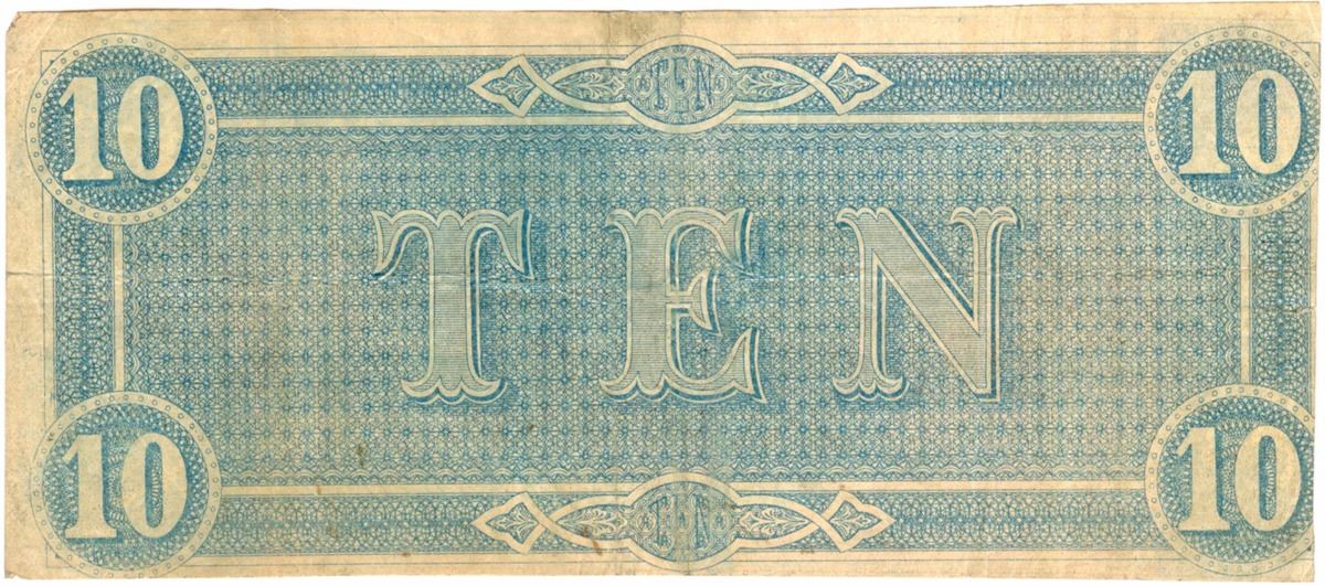 One $10 1864 Richmond Virginia Confederate States of America Large Note.