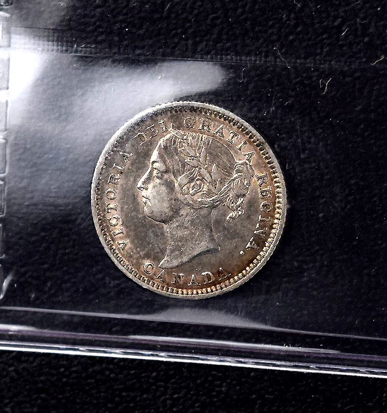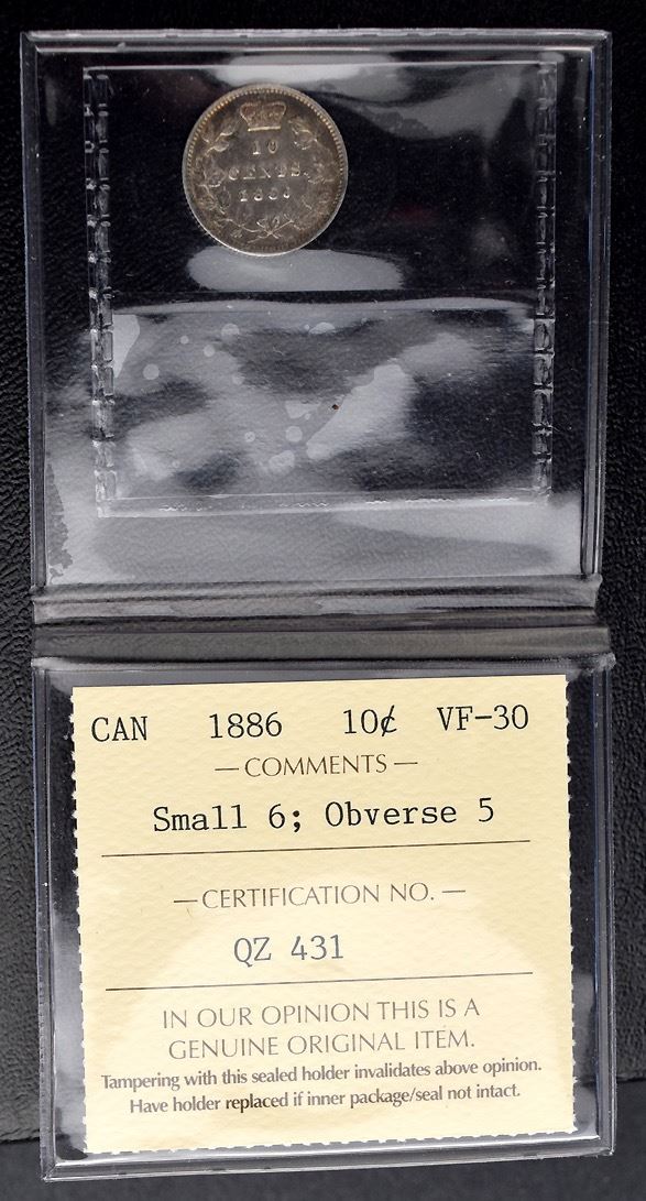 Canada 10¢, 1886, ICCS VF-30, noted : Small 6, Obverse 5. Medium toning, with enough peripheral luster and full hair to aproach a grade of VF.