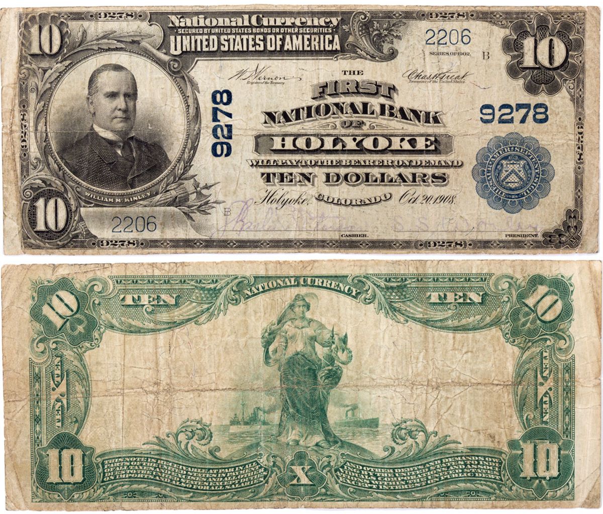 Holyoke is the county seat of Phillips County. There is only one note known in the census, but not this one. This is the lowest serial number and may be about the same grade or slightly less than the other known note in the census. -61921