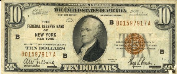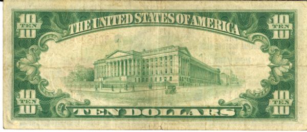 Fr. 1860-A $10 1929 Federal Reserve Bank Note in fair condition is missing a little from lower right corner araea and some toning.