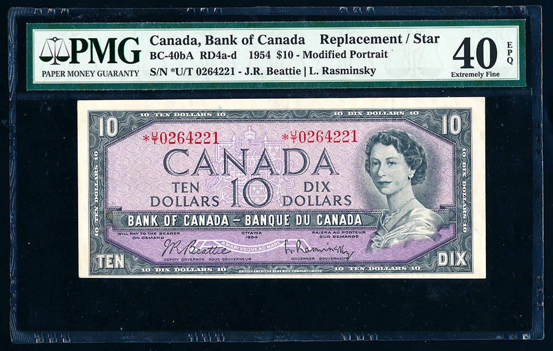 Bank of Canada, Ten Dollars, 1954, BC-40bA, RD4a-d, Modified Portrait, S/N: *U/T 0264221. Noted : Exceptional Papert Quality & rare Prefix. Certified PMG EF-40. Catalogue $900 cdn