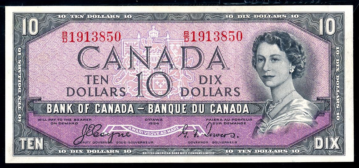 Bank of Canada, Ten Dollars, 1954 Coyne - Towers "Devil's Face", #BC-32a, S/N : B/D 1913850, graded Unc.