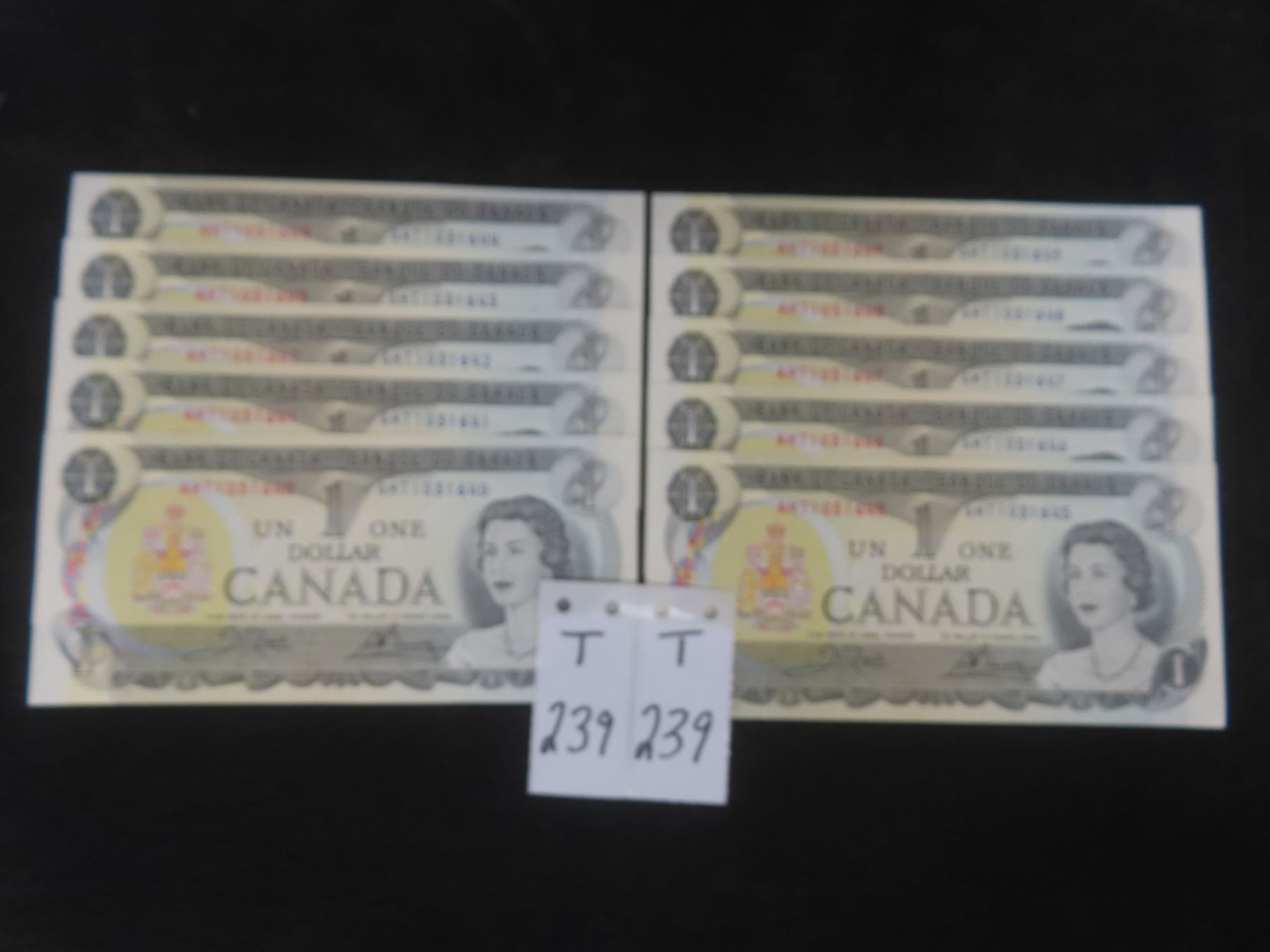 10 1973 Canadian $1 Bills, Uncirculated, With Consecutive Serial Numbers