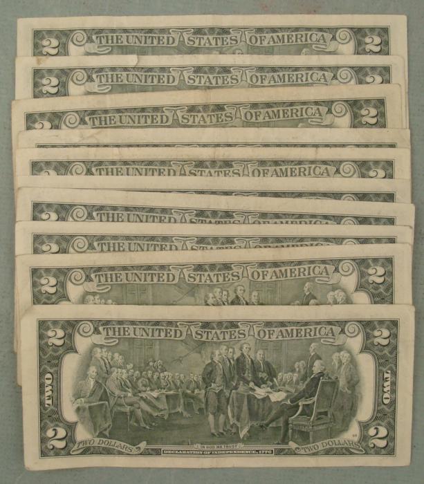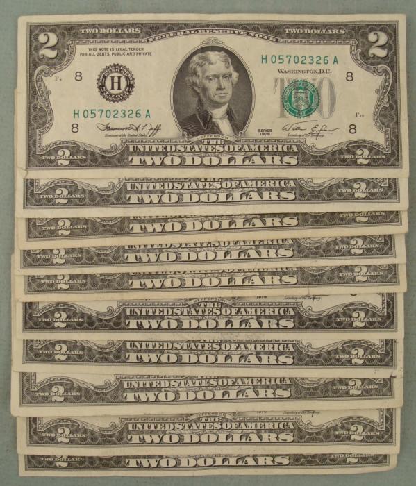 (10) 1976 $2 Bills * Mint mark: H (St Louis) Condition details: All nice bills, some Uncirculated * * *Bills pictured may be different from those you will receive