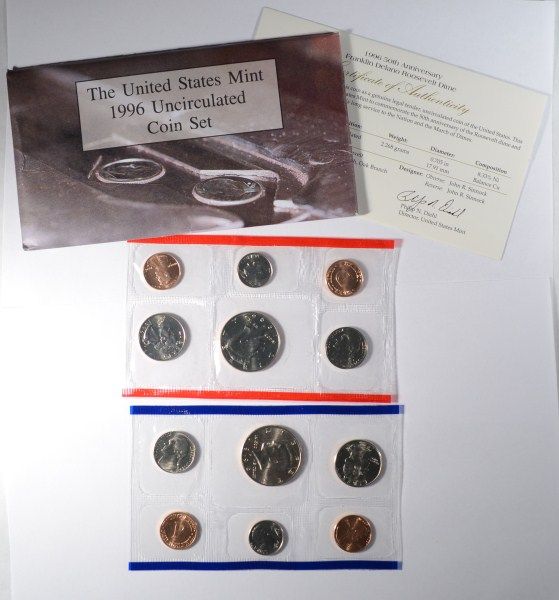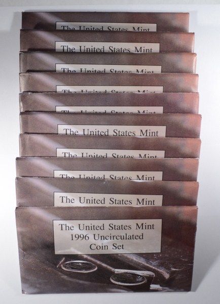 THESE SETS INCLUDE THE 1996-W 50Th ANNIVERSARY ROOSEVELT DIME, 2013 RED BOOK PRICE IS $20.00 FOR 1996-W DIME, ALL TEN SETS IN ONE LOT. EST $125.00 TO $140.00