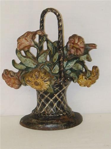 10" 19TH CENT. PAINT DECORATED CAST IRON BASKET OF FLOWERS DOORSTOP - PAINT LOSS, RUST, IMPERFECTIONS