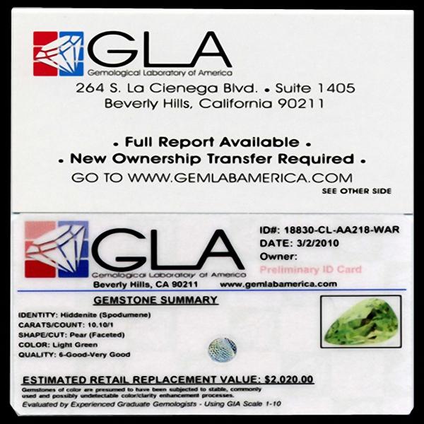 Very Good clear green specimen pear cut; lab quality evaluation 6; typical treatment likely; Gem Guide wholesale $505-$758; full retail appraisal $2020; full lab evaluation available
