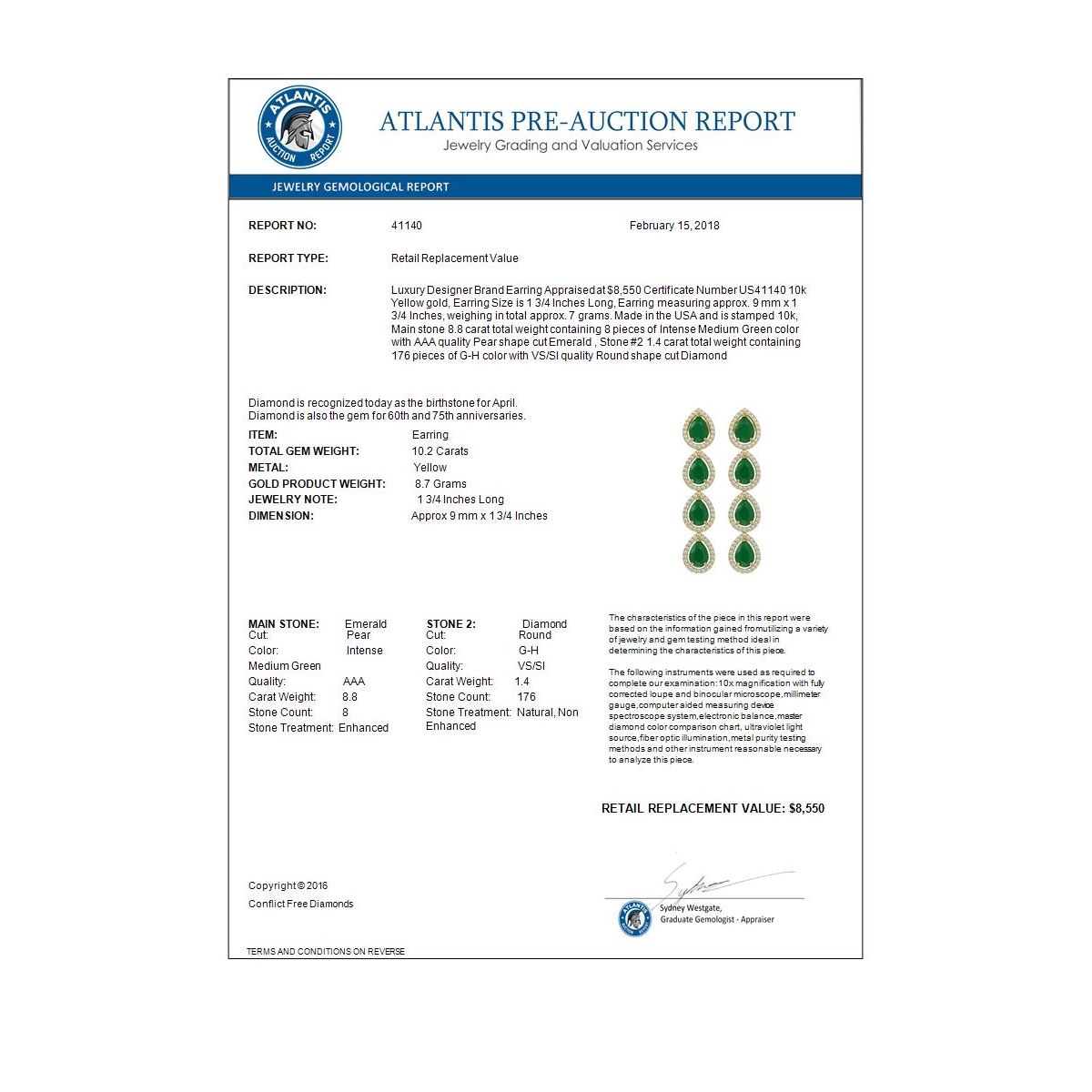 REF-155W5F -41140 ---- 10.2 CTW Emerald & Diamond Halo Earrings 10K Yellow Gold ---- Luxury Designer Brand Earring Appraised at $8,550 Certificate Number US41140 10k Yellow gold, Earring Size is 1 3/4 Inches Long, Earring measuring approx. 9 mm x 1 3/4 Inches, weighing in total approx. 7 grams. Made in the USA and is stamped 10k, Main stone 8.8 carat total weight containing 8 pieces of Intense Medium Green color with AAA quality Pear shape cut Emerald , Stone #2 1.4 carat total weight containing 176 pieces of G-H color with VS/SI quality Round shape cut Diamond
