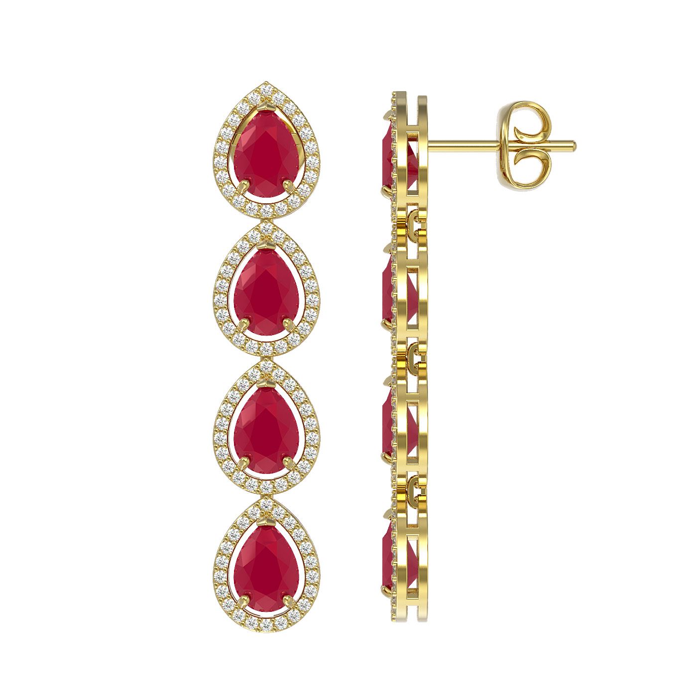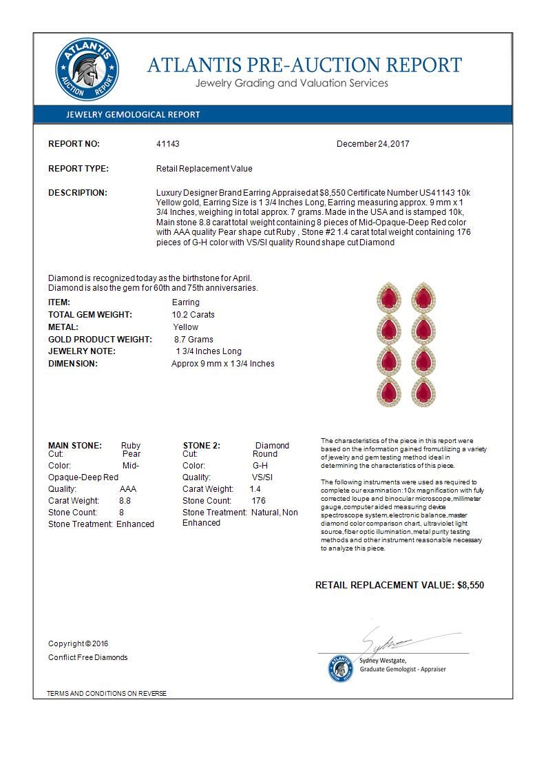 REF-155K5W -41143 ---- 10.2 CTW Ruby & Diamond Halo Earrings 10K Yellow Gold ---- Luxury Designer Brand Earring Appraised at $8,550 Certificate Number US41143 10k Yellow gold, Earring Size is 1 3/4 Inches Long, Earring measuring approx. 9 mm x 1 3/4 Inches, weighing in total approx. 7 grams. Made in the USA and is stamped 10k, Main stone 8.8 carat total weight containing 8 pieces of Mid-Opaque-Deep Red color with AAA quality Pear shape cut Ruby , Stone #2 1.4 carat total weight containing 176 pieces of G-H color with VS/SI quality Round shape cut Diamond