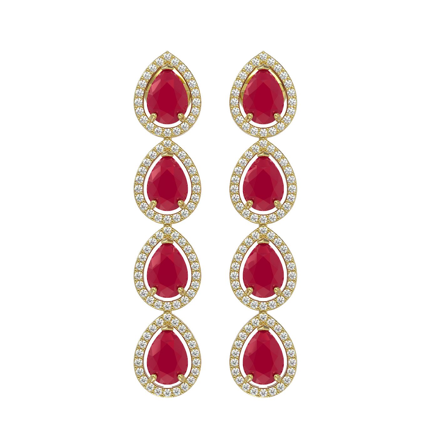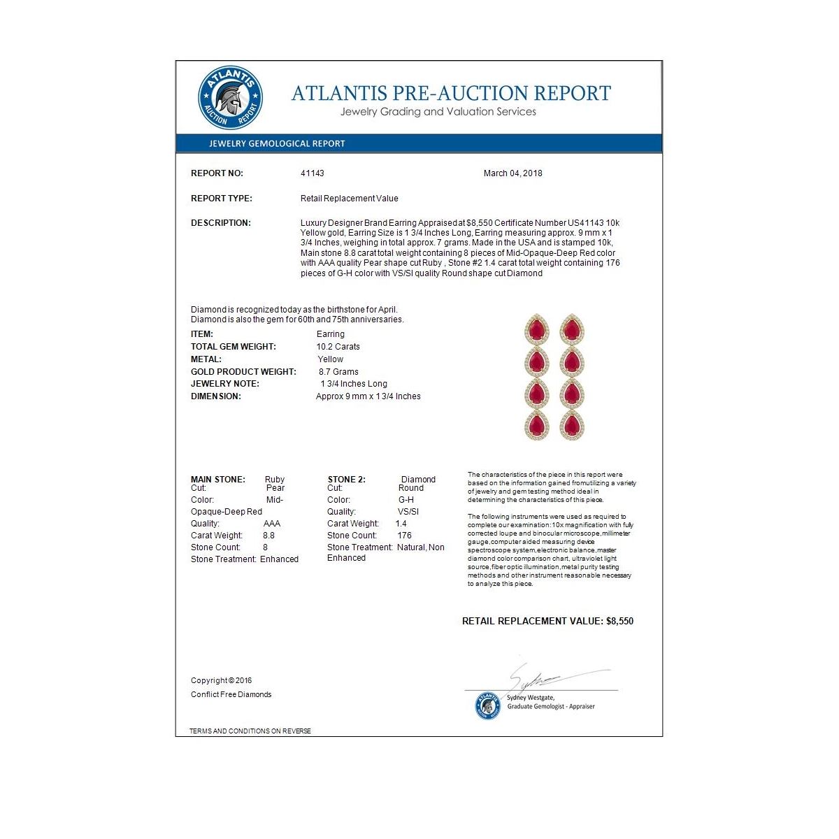 REF-155K5W -41143 ---- 10.2 CTW Ruby & Diamond Halo Earrings 10K Yellow Gold ---- Luxury Designer Brand Earring Appraised at $8,550 Certificate Number US41143 10k Yellow gold, Earring Size is 1 3/4 Inches Long, Earring measuring approx. 9 mm x 1 3/4 Inches, weighing in total approx. 7 grams. Made in the USA and is stamped 10k, Main stone 8.8 carat total weight containing 8 pieces of Mid-Opaque-Deep Red color with AAA quality Pear shape cut Ruby , Stone #2 1.4 carat total weight containing 176 pieces of G-H color with VS/SI quality Round shape cut Diamond