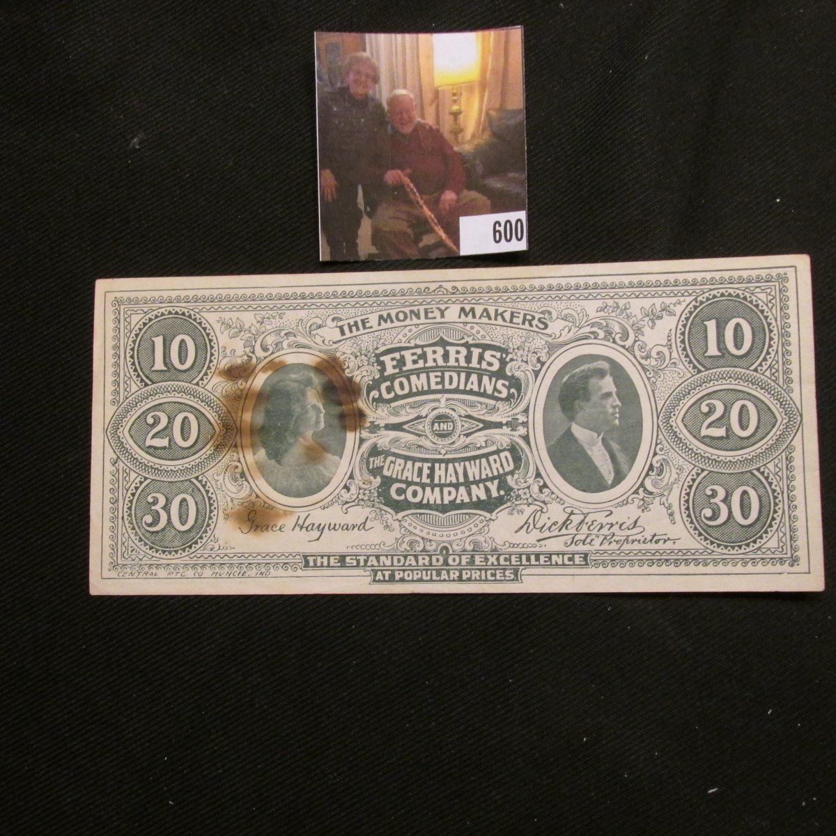 $10, 20, 30 Advertising Note "The Money Makers Ferris Comedians and The Grace Hayward Company" depicts Grace Hayward and Dick Ferris. "$20,000.00 Invested", slight amount of rust staining.