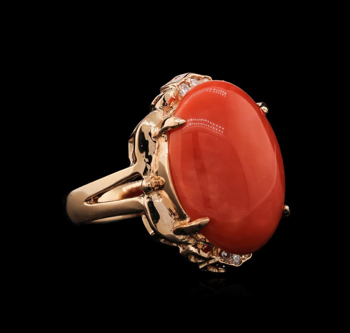 One ring featuring: 14KT rose gold weighing 8.38 grams containing one coral center stone with a total weight of 10.20ct and six diamonds with a total weight of 0.08ct.