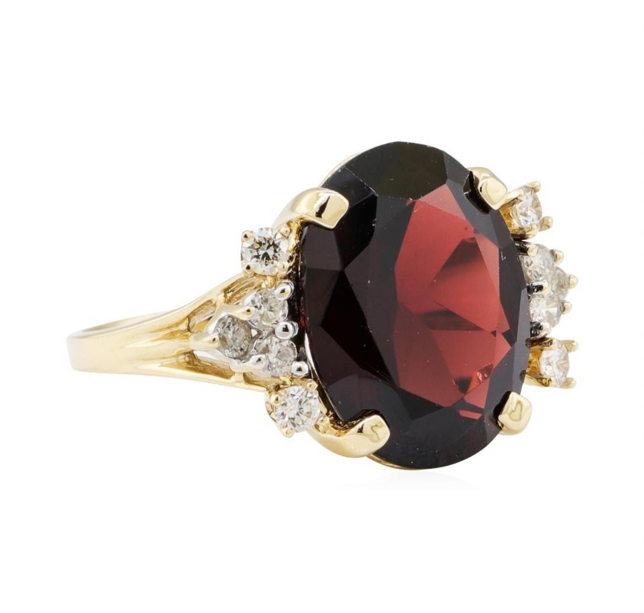 One ring featuring: 14KT yellow gold weighing 6.7 grams containing one garnet weighing 9.80ct and diamonds weighing 0.40ctw.