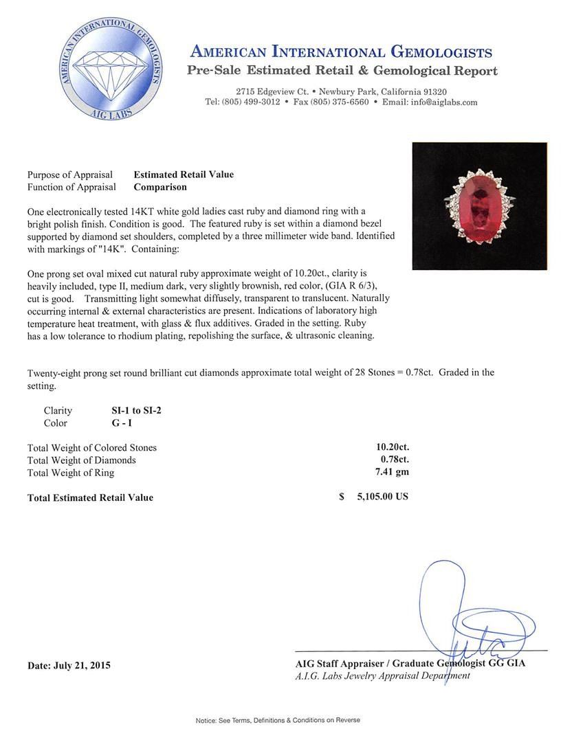 One electronically tested 14KT white gold ladies cast ruby and diamond ring with a bright polish finish. The featured ruby is set within a diamond bezel supported by diamond set shoulders, completed by a three millimeter wide band. Identified with markings of "14K". Condition is good. Containing: One prong set oval mixed cut natural ruby approximate weight of 10.20ct., clarity is heavily included, type II, medium dark, very slightly brownish, red color, (GIA R 6/3), cut is good. Transmitting light somewhat diffusely, transparent to translucent. Naturally occurring internal & external characteristics are present. Indications of laboratory high temperature heat treatment, with glass & flux additives. Graded in the setting. Ruby has a low tolerance to rhodium plating, repolishing the surface, & ultrasonic cleaning. Twenty-Eight prong set round brilliant cut diamonds approximate total weight of 28 Stones = 0.78ct. Graded in the setting. Clarity SI-1 to SI-2 Color G - I. Total Weight of Colored Stones 10.20ct. Total Weight of Diamonds 0.78ct. Total Weight of Ring 7.41 grams. AIG Appraised at $5,105.00.