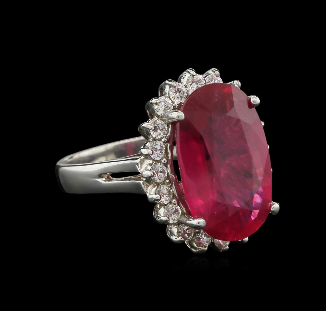One electronically tested 14KT white gold ladies cast ruby and diamond ring with a bright polish finish. The featured ruby is set within a diamond bezel supported by diamond set shoulders, completed by a three millimeter wide band. Identified with markings of "14K". Condition is good. Containing: One prong set oval mixed cut natural ruby approximate weight of 10.20ct., clarity is heavily included, type II, medium dark, very slightly brownish, red color, (GIA R 6/3), cut is good. Transmitting light somewhat diffusely, transparent to translucent. Naturally occurring internal & external characteristics are present. Indications of laboratory high temperature heat treatment, with glass & flux additives. Graded in the setting. Ruby has a low tolerance to rhodium plating, repolishing the surface, & ultrasonic cleaning. Twenty-Eight prong set round brilliant cut diamonds approximate total weight of 28 Stones = 0.78ct. Graded in the setting. Clarity SI-1 to SI-2 Color G - I. Total Weight of Colored Stones 10.20ct. Total Weight of Diamonds 0.78ct. Total Weight of Ring 7.41 grams. AIG Appraised at $5,105.00.