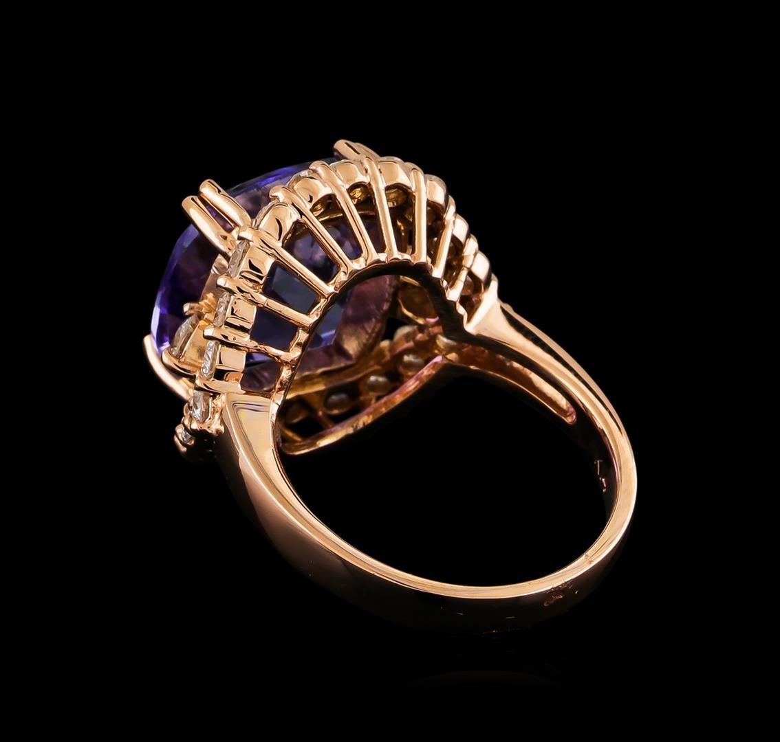 One electronically tested 14KT rose gold ladies cast tanzanite and diamond ring with a bright polish finish. The featured tanzanite is set within a stylized diamond bezel supported by a ribbed under gallery, completed by a three millimeter wide band. Identified with markings of "K14". Condition is new, good workmanship. Containing: One prong set square cushion mixed cut natural tanzanite, measuring 12.40 x 12.30 x 8.50mm, approximate weight of 10.21ct., clarity is eye clean, type I, medium dark, very slightly grayish, violet color, (GIA V 6/3), cut is good. Transmitting light with no distortion, transparent. Colored Stone Grading Report attached. Graded in the setting. Tanzanite is a very rare gemstone that is only found in the country of Tanzania. Originally discovered in 1967. Tiffany & Company, named the stone Tanzanite. It is found in the Usumburu Mountains that border the Umba Valley of northern Tanzania. Tanzanite occurs in gray, brown, violet, blue, reddish-purple, & green. The gem is interesting because of its exceptional pleochroism. Rotated in different directions a tanzanite will exhibit multiple changes of color. Tanzanite has a low tolerance to ultrasonic cleaning, and should not be cleaned using this method. Two prong set round brilliant cut diamonds, measuring 3.00 - 3.00 x 1.80mm (depth est.) approximate total weight of 2 Stones = 0.20ct. Graded in the setting. Clarity: I-1 to I-2. Color: G - H Twenty-Two prong set round brilliant cut diamonds, measuring 2.40 - 2.40 x 1.44mm (depth est.) approximate total weight of 22 Stones = 1.12ct. Graded in the setting. Clarity: SI-2 to I-2. Color: G - I. Total Weight of Colored Stones 10.21ct. Total Weight of Diamonds 1.32ct. Total Weight of Ring 9.33gm. AIG Appraised at $26,815.00.