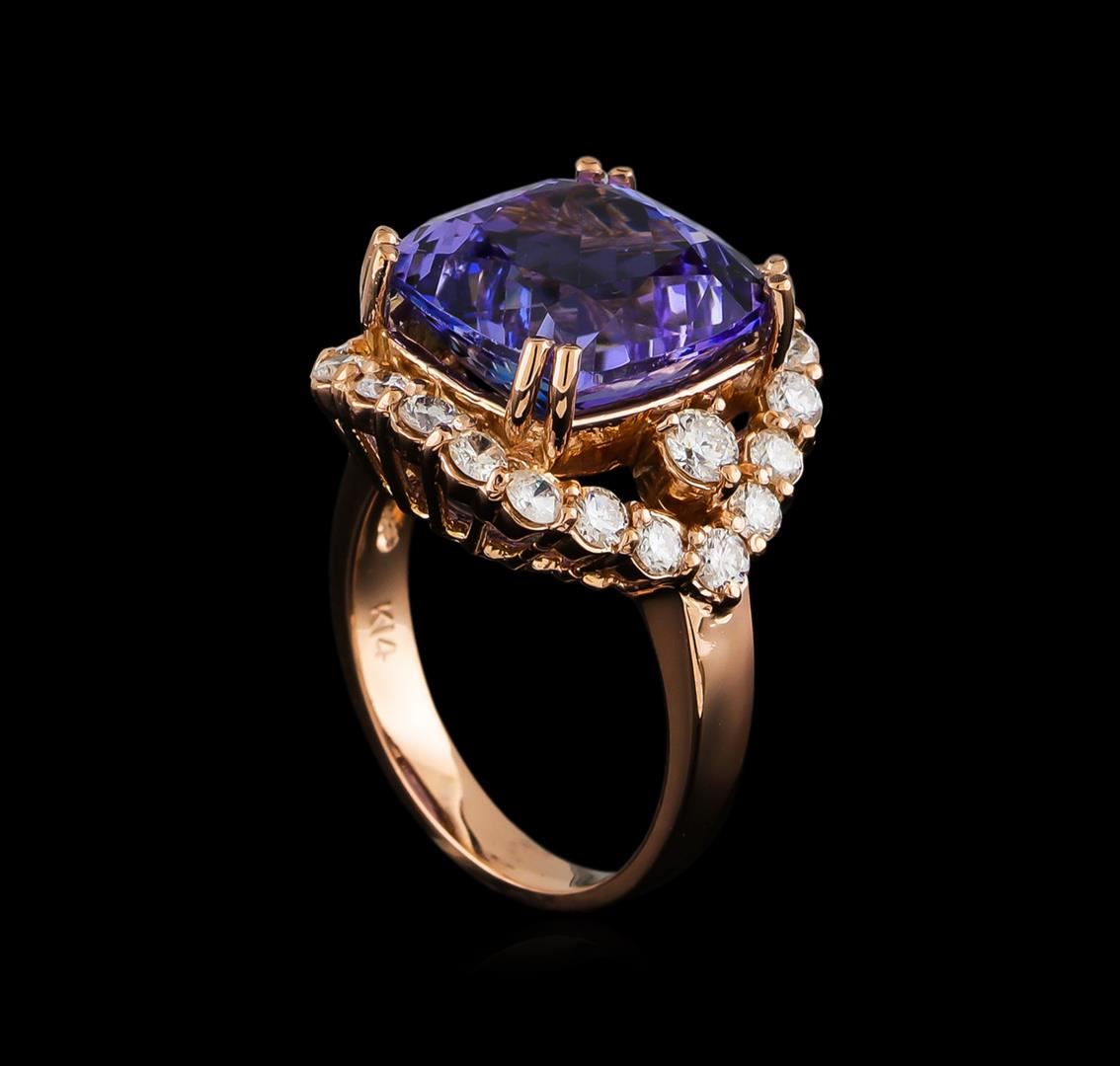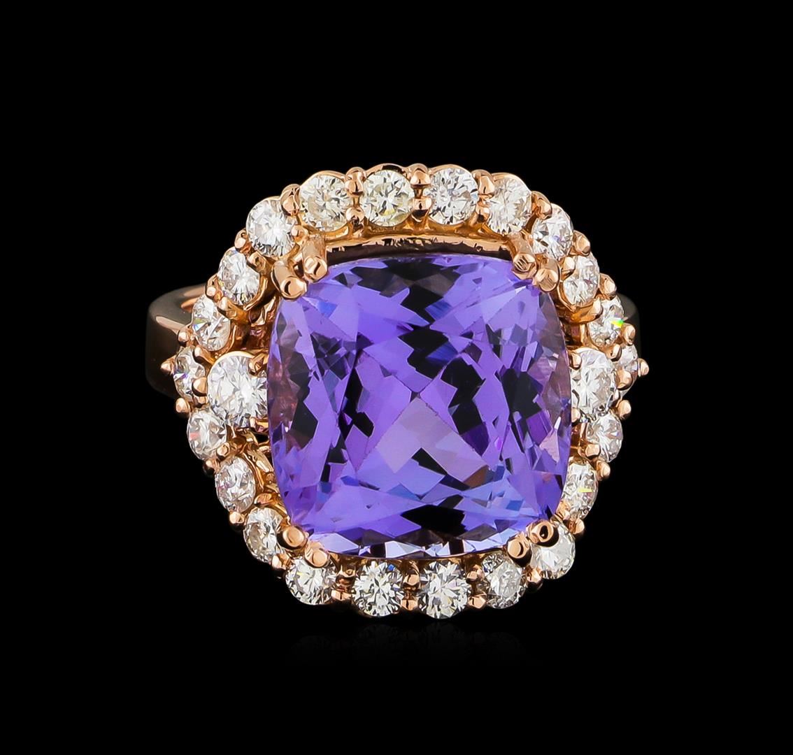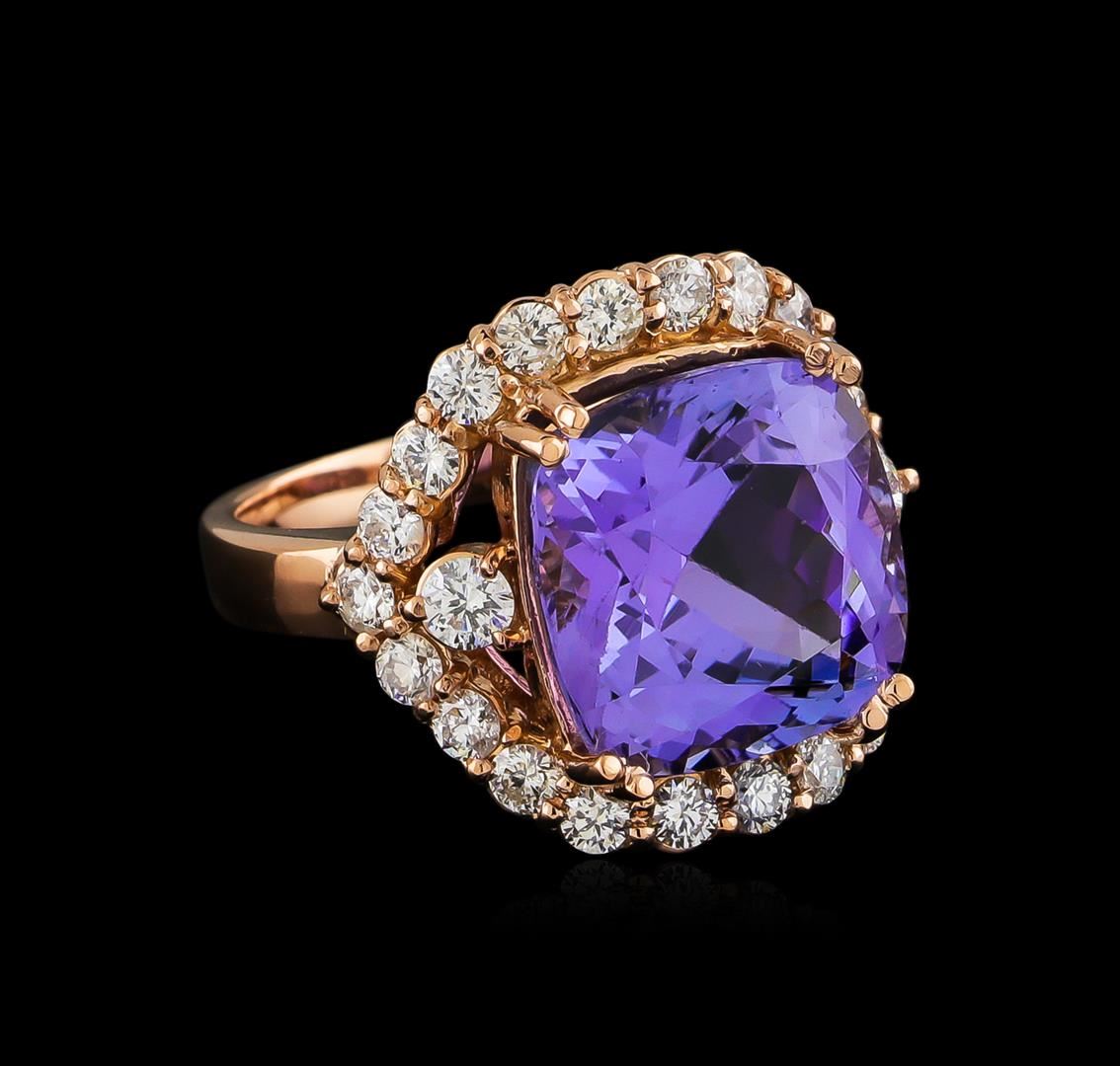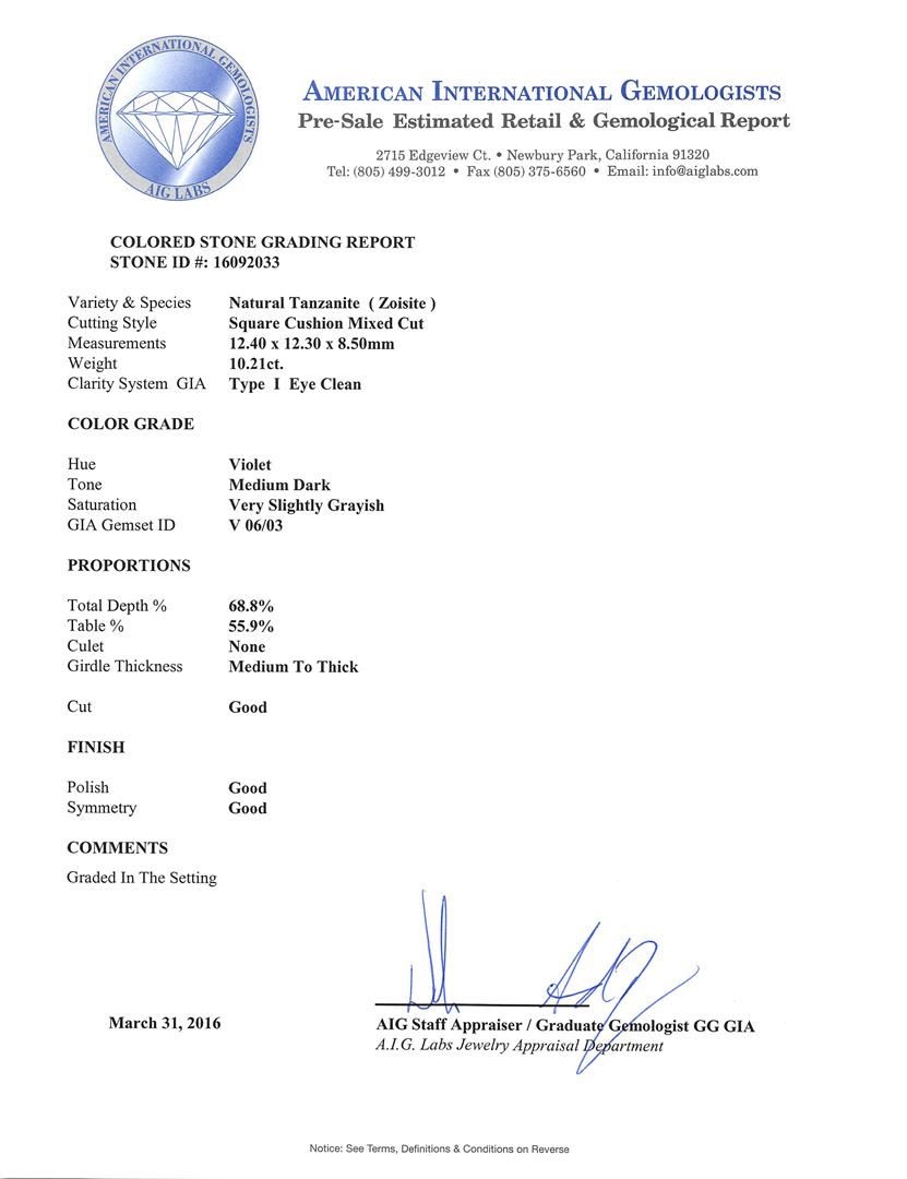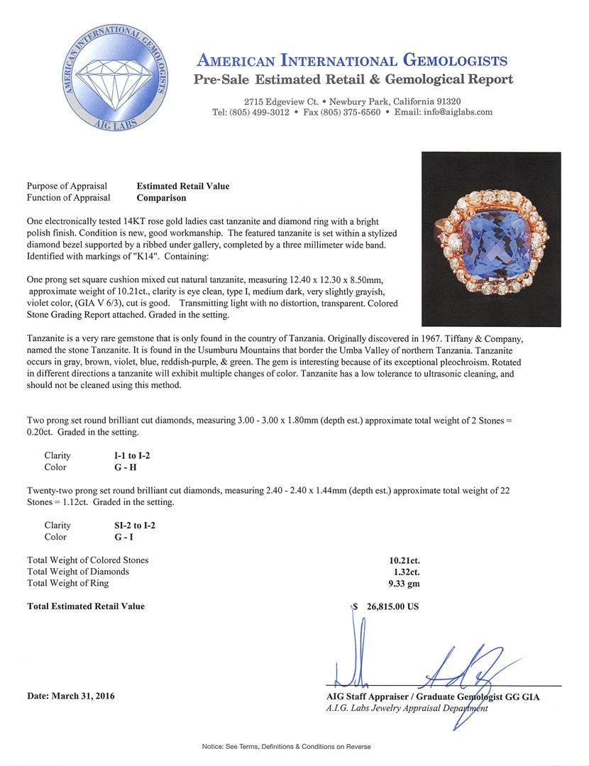 One electronically tested 14KT rose gold ladies cast tanzanite and diamond ring with a bright polish finish. The featured tanzanite is set within a stylized diamond bezel supported by a ribbed under gallery, completed by a three millimeter wide band. Identified with markings of "K14". Condition is new, good workmanship. Containing: One prong set square cushion mixed cut natural tanzanite, measuring 12.40 x 12.30 x 8.50mm, approximate weight of 10.21ct., clarity is eye clean, type I, medium dark, very slightly grayish, violet color, (GIA V 6/3), cut is good. Transmitting light with no distortion, transparent. Colored Stone Grading Report attached. Graded in the setting. Tanzanite is a very rare gemstone that is only found in the country of Tanzania. Originally discovered in 1967. Tiffany & Company, named the stone Tanzanite. It is found in the Usumburu Mountains that border the Umba Valley of northern Tanzania. Tanzanite occurs in gray, brown, violet, blue, reddish-purple, & green. The gem is interesting because of its exceptional pleochroism. Rotated in different directions a tanzanite will exhibit multiple changes of color. Tanzanite has a low tolerance to ultrasonic cleaning, and should not be cleaned using this method. Two prong set round brilliant cut diamonds, measuring 3.00 - 3.00 x 1.80mm (depth est.) approximate total weight of 2 Stones = 0.20ct. Graded in the setting. Clarity: I-1 to I-2. Color: G - H Twenty-Two prong set round brilliant cut diamonds, measuring 2.40 - 2.40 x 1.44mm (depth est.) approximate total weight of 22 Stones = 1.12ct. Graded in the setting. Clarity: SI-2 to I-2. Color: G - I. Total Weight of Colored Stones 10.21ct. Total Weight of Diamonds 1.32ct. Total Weight of Ring 9.33gm. AIG Appraised at $26,815.00.