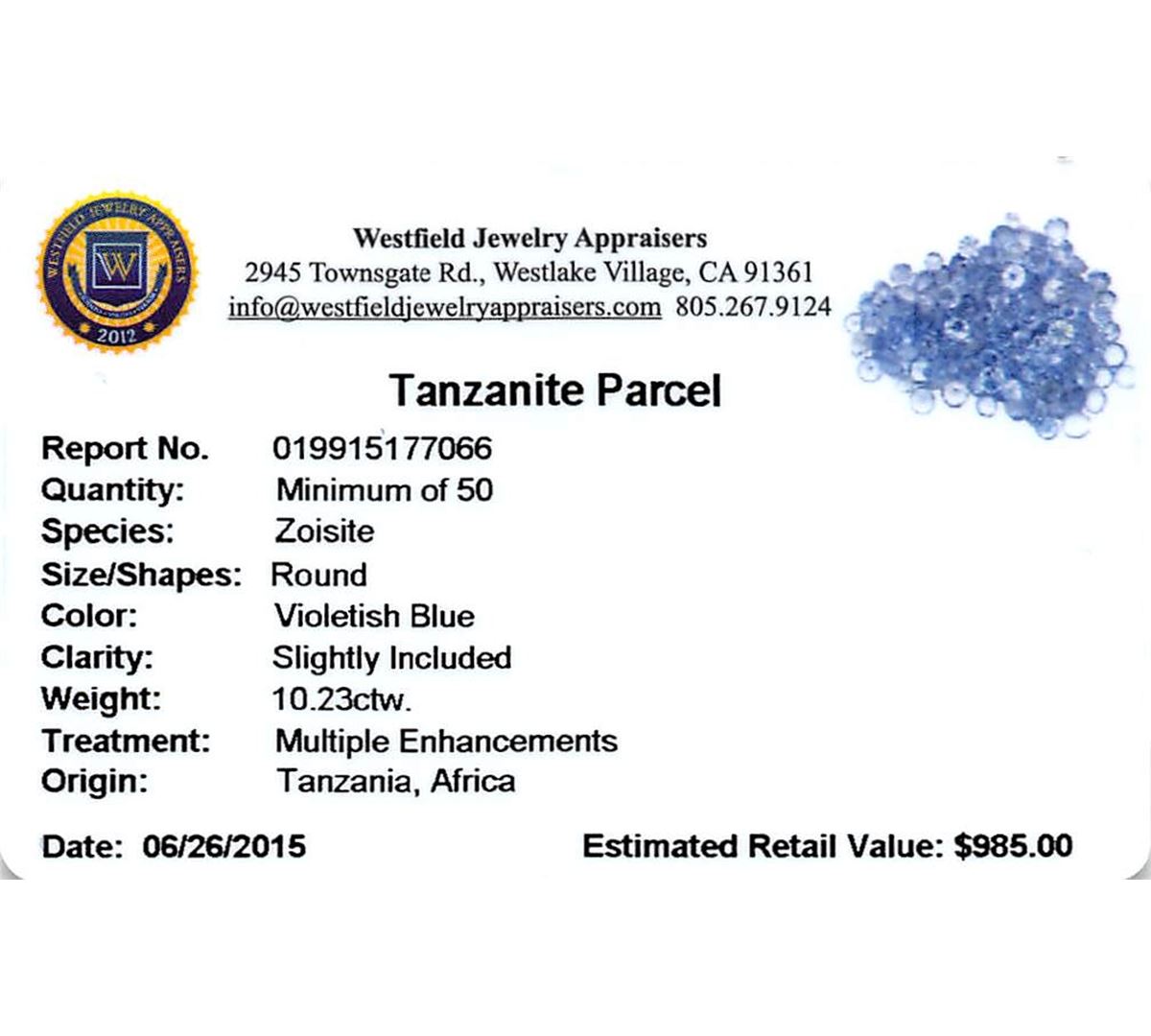Fifty round mixed cut natural tanzanites, measuring 2.00 - 2.00 x 1.30 mm, exact total weight 10.23ct., clarity is slightly included, type I, medium light, very slightly grayish, violetish blue color, (GIA vB 4/3), cut is good. Measurements & the color grade are an average for the group, Color grade is an average for the group, Transmitting light with no distortion, transparent, Naturally occurring internal & external characteristics are present, Indications of multiple laboratory enhancements, including high temperature heat treatment. Westfield Appraised at $985.00.