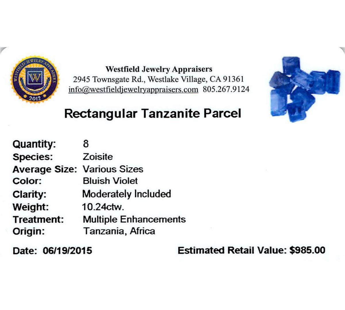 Eight rectangular step cut natural tanzanites exact total weight 10.24ct., clarity is moderately included, type I, medium dark, very slightly grayish, bluish violet color, (GIA bV 6/3), cut is good. Transmitting light with a minimum of distortion, transparent. Naturally occurring internal & external characteristics are present. Color grade is an average for the group. Tanzanite is a very rare gemstone that is only found in the country of Tanzania. Originally discovered in 1967. Tiffany & Company, named the stone Tanzanite. It is found in the Usumburu Mountains that border the Umba Valley of northern Tanzania. Tanzanite occurs in gray, brown, violet, blue, reddish-purple, & green. The gem is interesting because of its exceptional pleochroism. Rotated in different directions a tanzanite will exhibit multiple changes of color. Tanzanite has a low tolerance to ultrasonic cleaning, and should not be cleaned using this method. Westfield Appraised at $985.00.