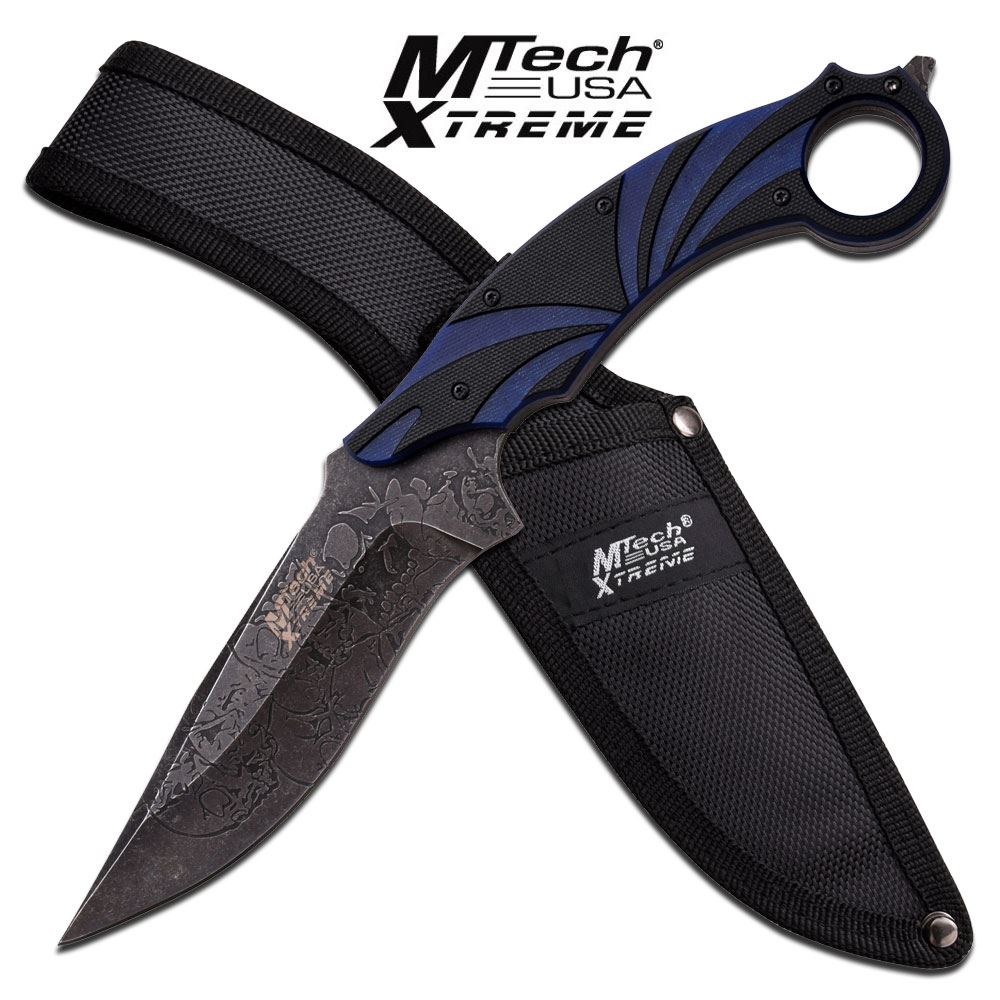 10.25" BLUE AND BLACK HANDLE FULL TANG FIXED BLADE KNIF **|**|** 10.25" BLUE AND BLACK HANDLE FULL TANG FIXED BLADE KNIFE COMES W/NYLON SHEATH; ACID ETCHED BLADE
