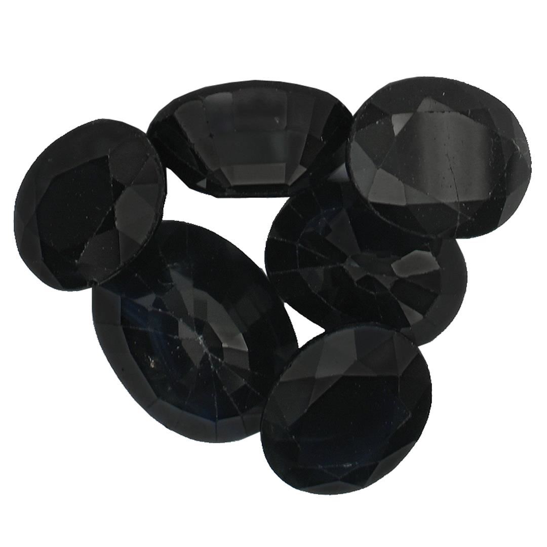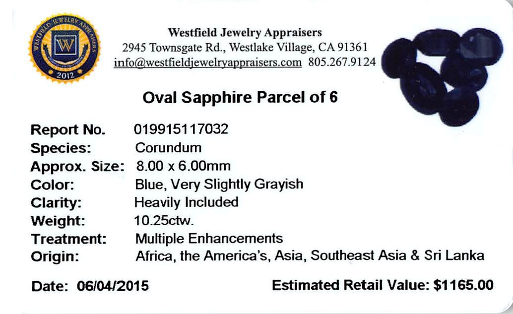 Six oval mixed cut natural blue sapphires, measuring 8.00 x 6.00 x 4.00mm, exact total weight 10.25ct., clarity is heavily included, type II, very dark, very slightly grayish, blue color, (GIA B 8/3), cut is good. Measurements are an average for the g Westfield Appraised at $1,165.00.