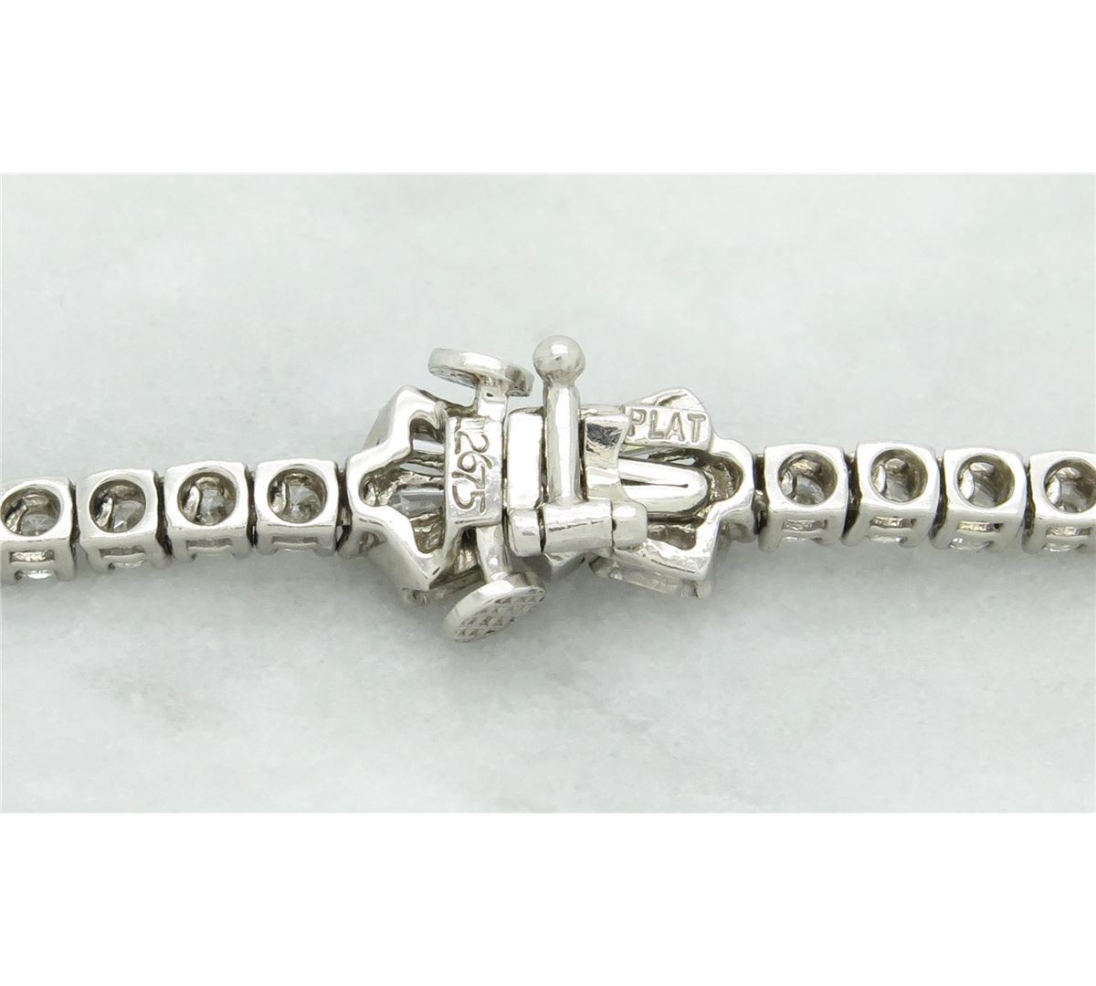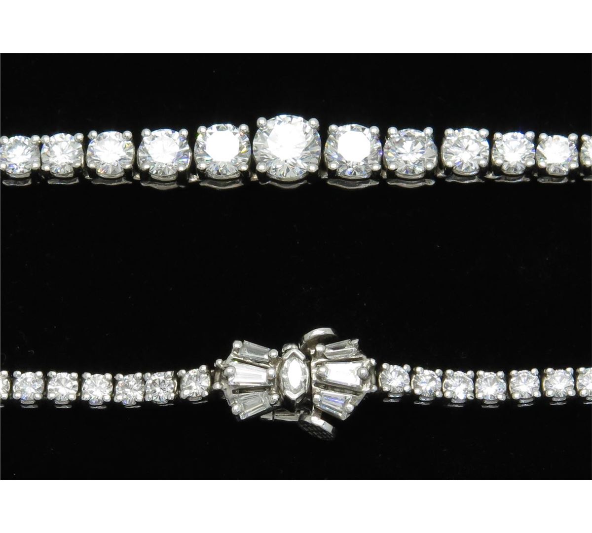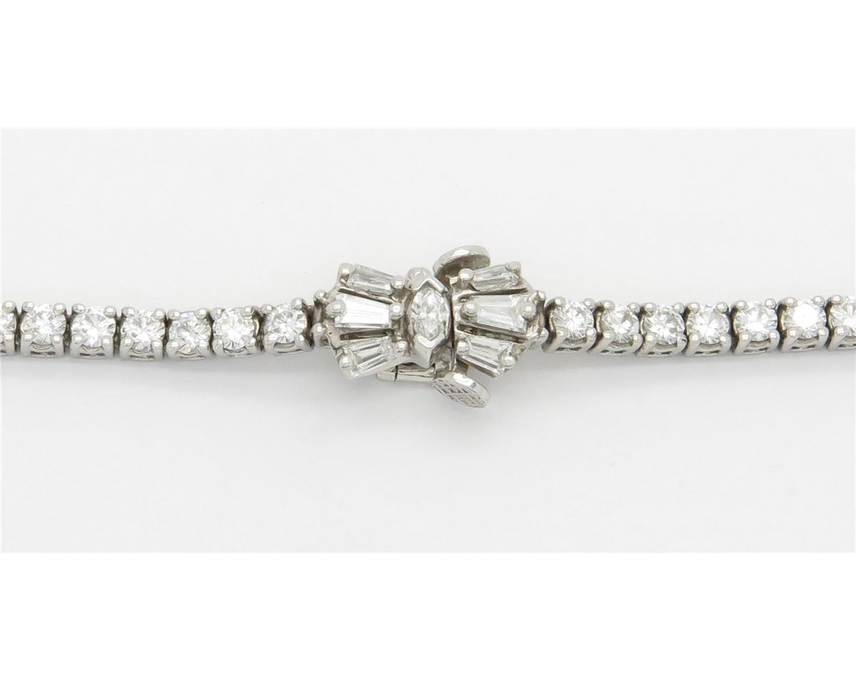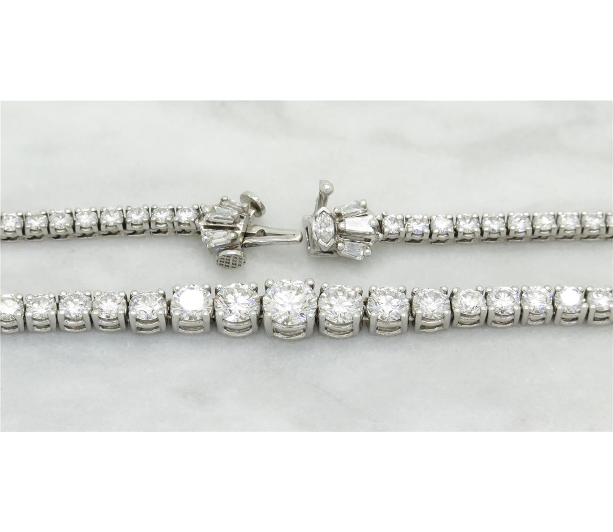 One tested platinum diamond necklace. Containing: 128 Round Brilliant Cut Diamonds. 6 Baguette Cut Diamonds, 1 Marquise Cut Diamond. Clarity: VS-SI, Color: D-G. Approximate total diamond weight: 10.28CTW. The largest diamond weighs approximately .76CT with E-F color and VS1 clarity. All diamonds are graded in the mounting unless otherwise stated. Weight of necklace: 37.1 grams, Size: 16.5" long. The clasp on the necklace has a very unique diamond bow.