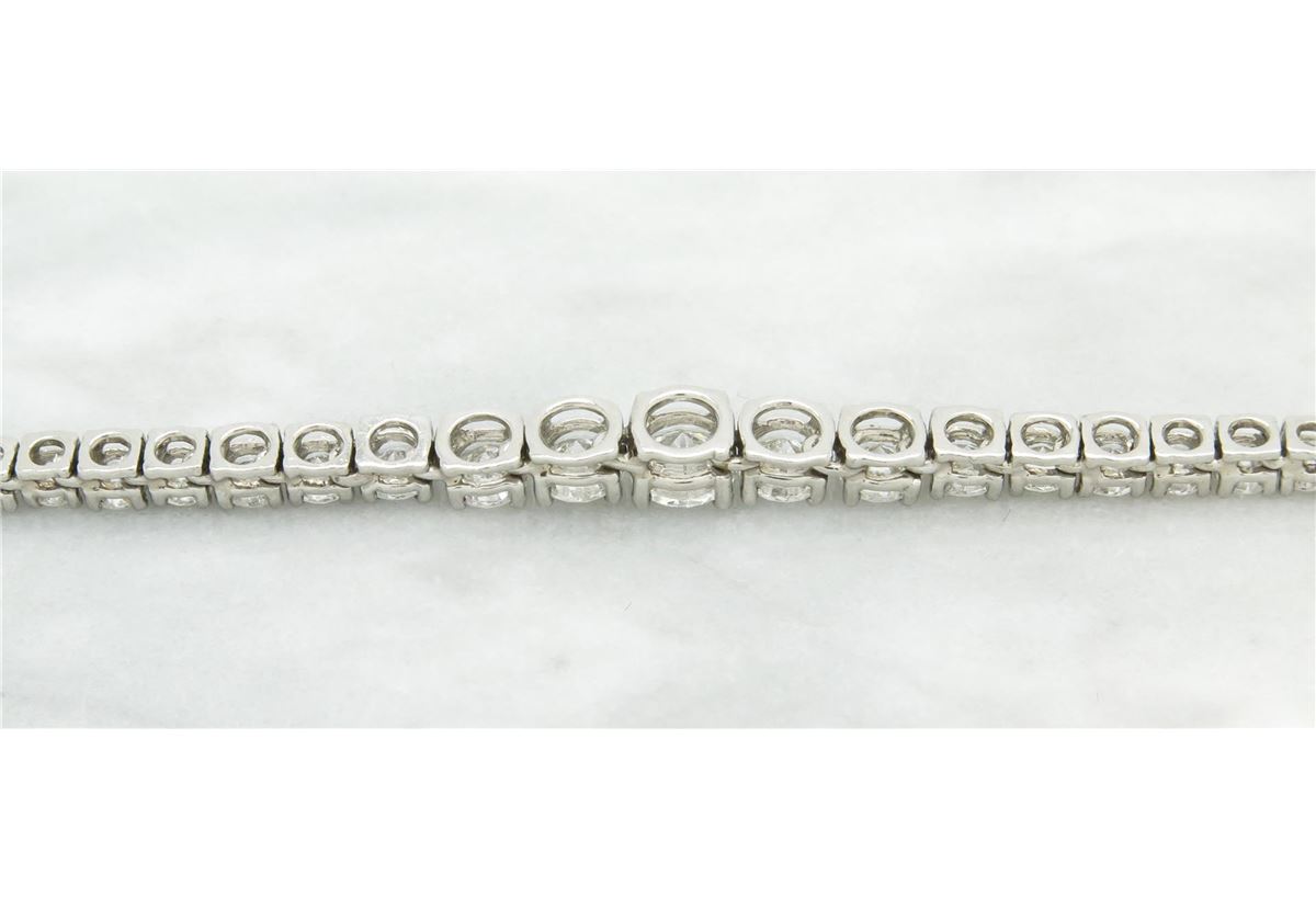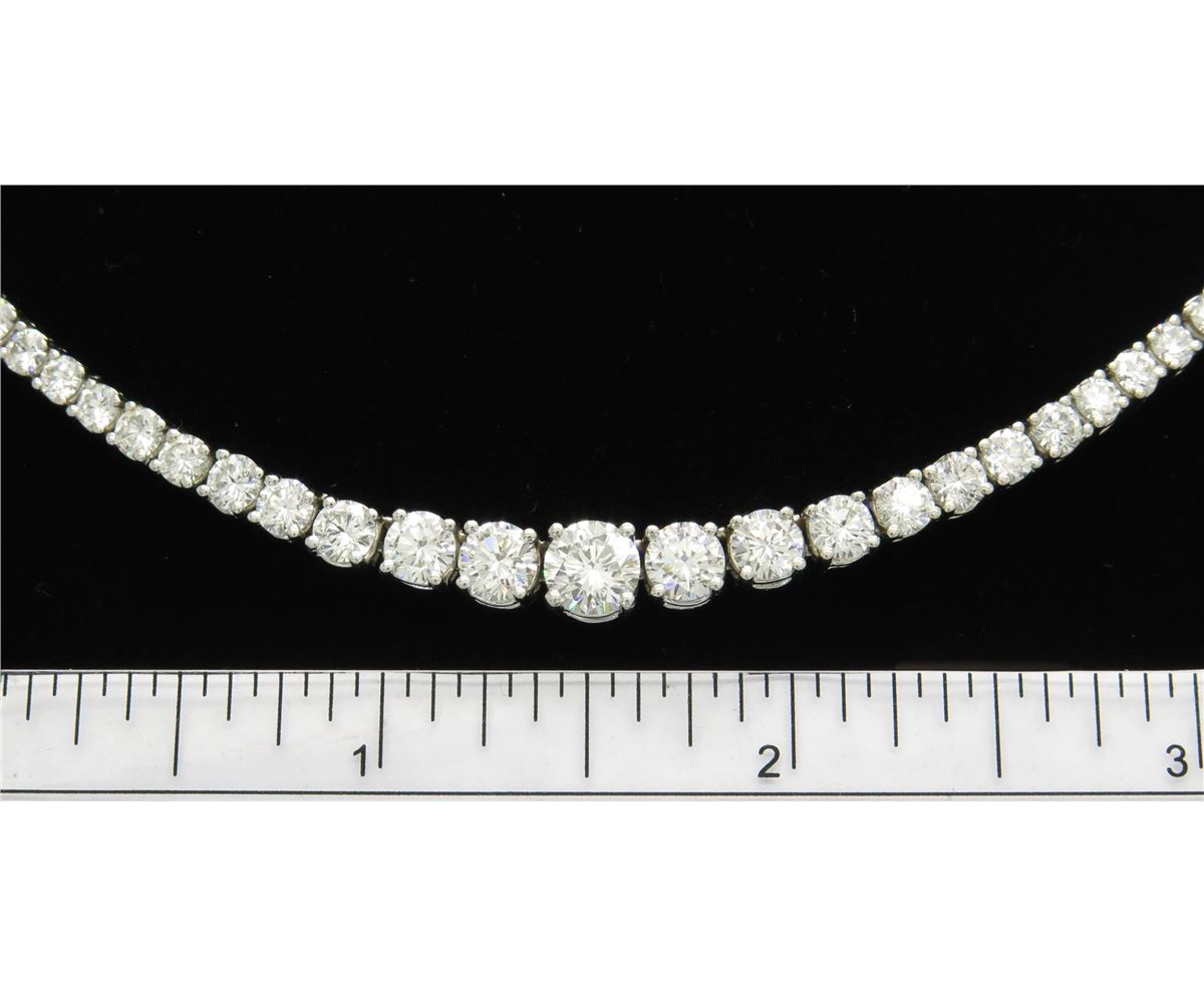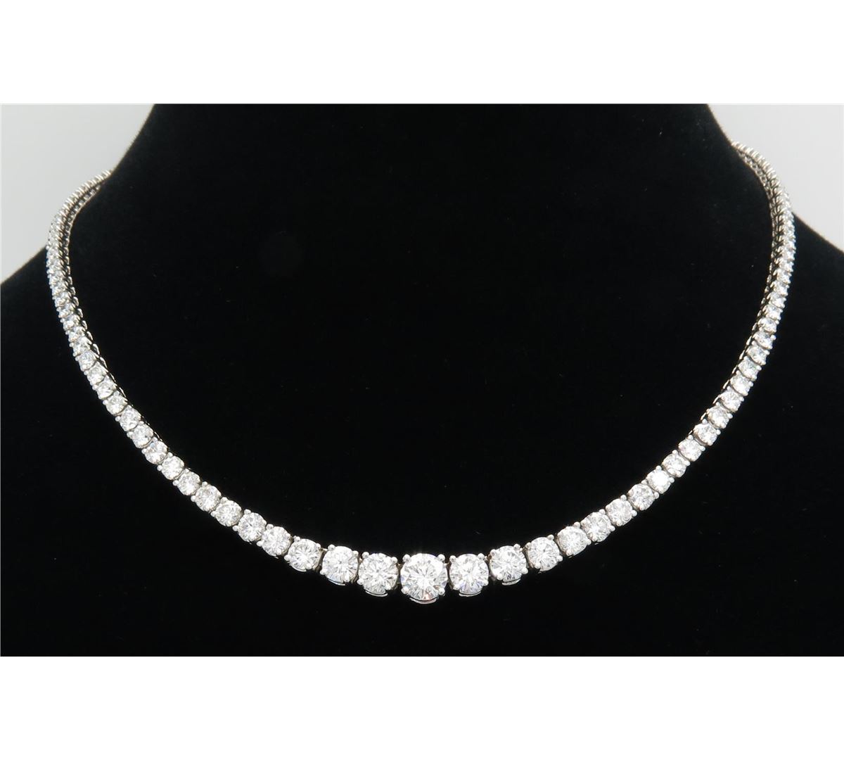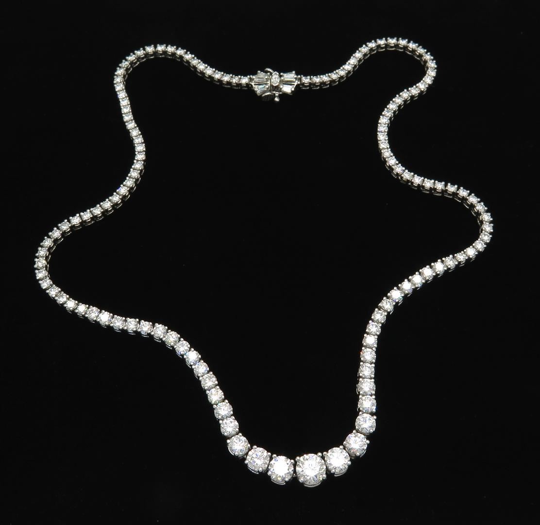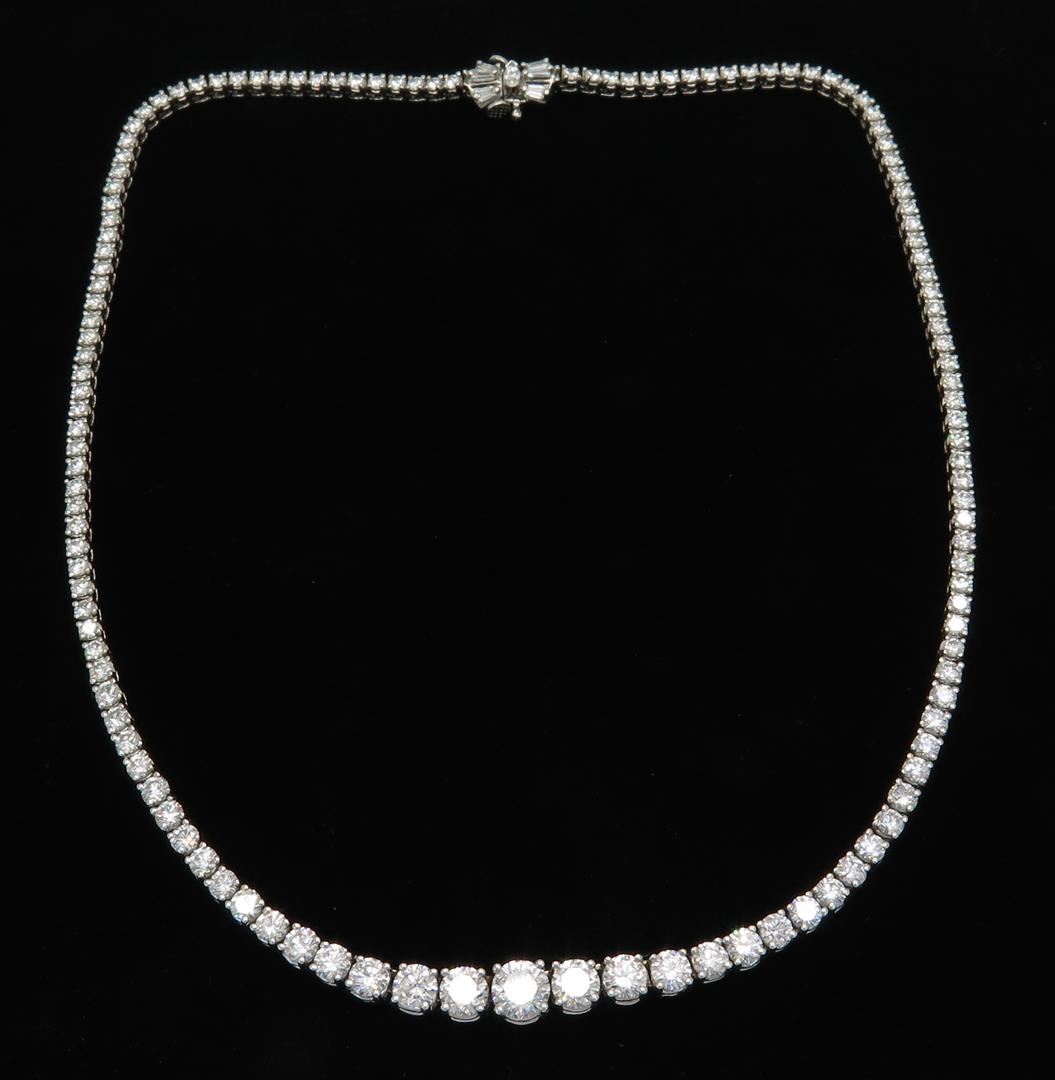 One tested platinum diamond necklace. Containing: 128 Round Brilliant Cut Diamonds. 6 Baguette Cut Diamonds, 1 Marquise Cut Diamond. Clarity: VS-SI, Color: D-G. Approximate total diamond weight: 10.28CTW. The largest diamond weighs approximately .76CT with E-F color and VS1 clarity. All diamonds are graded in the mounting unless otherwise stated. Weight of necklace: 37.1 grams, Size: 16.5" long. The clasp on the necklace has a very unique diamond bow.