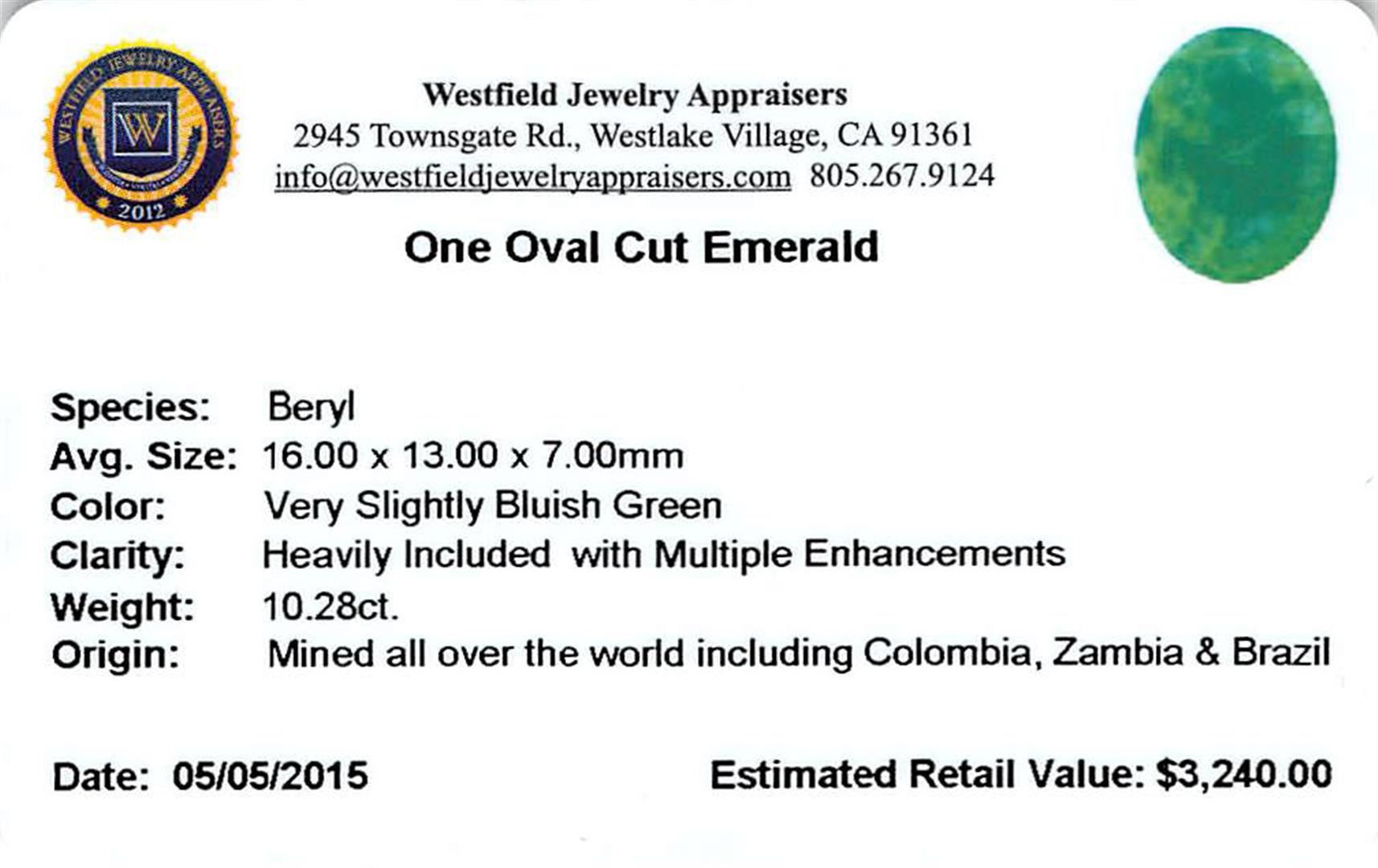 One oval cut natural emerald, measuring 16.00 x 13.00 x 7.00mm, exact weight 10.28ct., clarity is moderately included, type III, medium dark, very slightly grayish, very slightly bluish green color, (GIA vslbG 6/3), cut is good. Indications of multiple laboratory enhancements, including high temperature heat treatment._x000D_ Westfield Appraised at $3,240.00.
