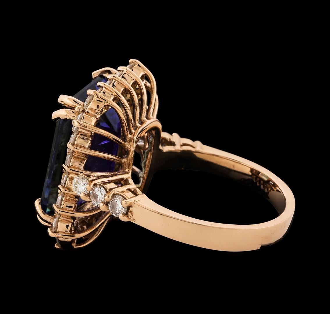 One electronically tested 14KT rose gold lady's cast fashion ring with a cathedral shank with a basket halo with a bright polish finish. The featured lady's ring has a shank measuring 2.75 millimeters wide. Identified with markings of 'K14'. Condition is new, good workmanship. Containing: One prong set emerald standard step cut natural tanzanite, measuring 15.23 x 11.50 x 6.70mm, (depth est.) approximate weight of 10.28ct., clarity is eye clean, medium, moderately strong, violetish blue color, (GIA vB 5/4), cut is very good. Transmitting light with no distortion, transparent. Colored gemstones are presumed to have been subjected to commonly used enhancement processes. Graded in the setting. Twenty-Eight prong set round brilliant cut diamonds, measuring 2.50 - 2.40 x 1.49mm (depth est.) approximate total weight of 28 Stones = 1.53ct. Graded in the setting. Clarity SI-1 to I-1. Color: G - I Cut Good. Total Weight of Colored Stones 10.28ct.. Total Weight of Diamonds 1.53ct.. Total Weight of Ring 9.50gm. GAS Appraised at $18,805.00.
