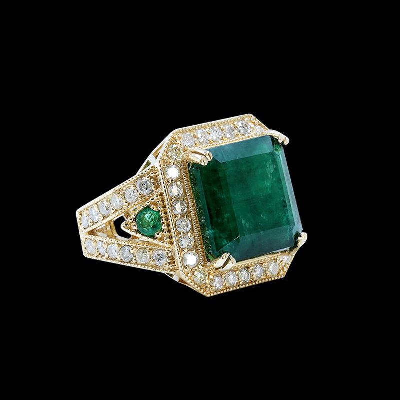 14K Y/G NATURAL COLUMBIAN EMERALD RING :11.71GM/DIA :1.36CT/EMERALD SMALL :0.24CT/ EMERALD: 10.28CT/#GVR1368