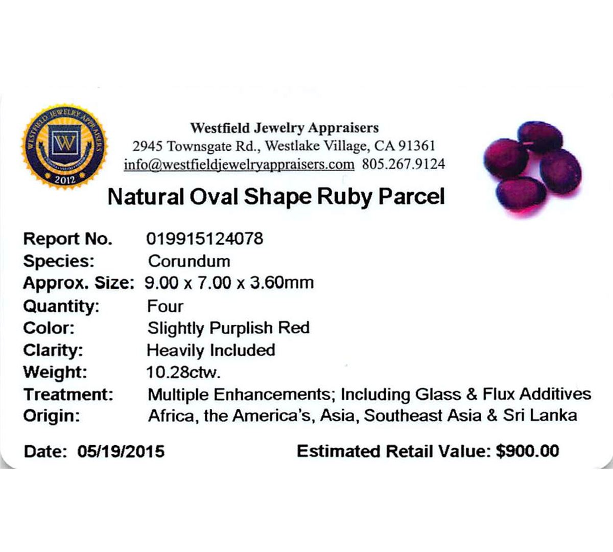 Four oval mixed cut natural rubies, measuring 9.00 x 7.00 x 3.60mm, exact total weight 10.28ct., clarity is heavily included, type II, dark, very slightly brownish, slightly purplish red color, (GIA slpR 7/3), cut is good. Measurements are an average for the group. Transmitting light somewhat diffusely, transparent to translucent. Naturally occurring internal & external characteristics are present. Indications of laboratory high temperature heat treatment, with glass & flux additives. Westfield Appraised at $900.00.