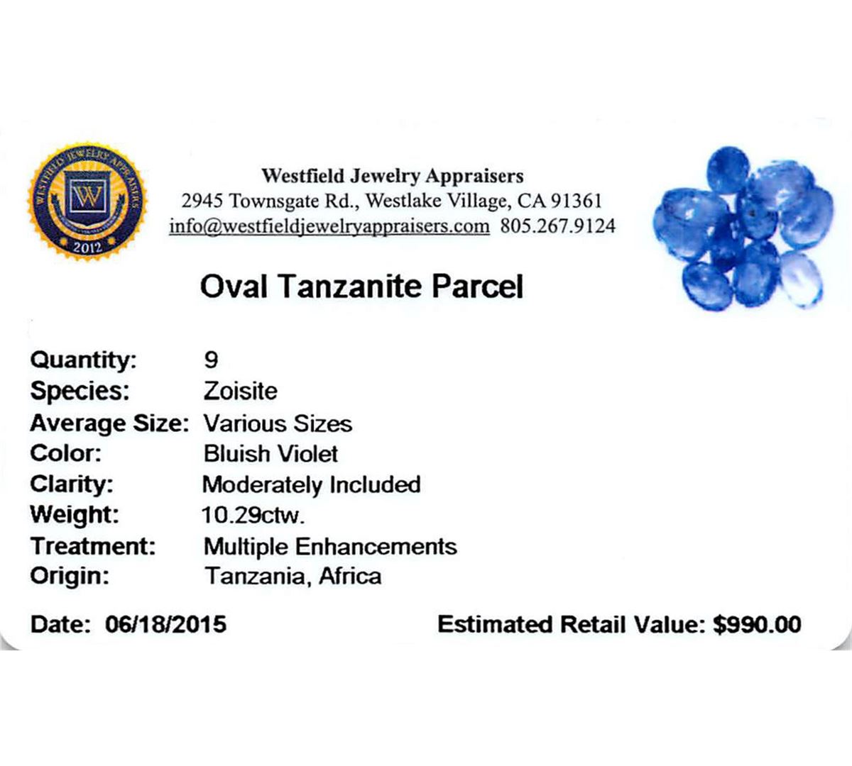 Nine oval mixed cut natural tanzanites exact total weight 10.29ct., clarity is moderately included, type I, medium dark, very slightly grayish, bluish violet color, (GIA bV 6/3), cut is good. Transmitting light with a minimum of distortion, transparent. Naturally occurring internal & external characteristics are present. Color grade is an average for the group. Tanzanite is a very rare gemstone that is only found in the country of Tanzania. Originally discovered in 1967. Tiffany & Company, named the stone Tanzanite. It is found in the Usumburu Mountains that border the Umba Valley of northern Tanzania. Tanzanite occurs in gray, brown, violet, blue, reddish-purple, & green. The gem is interesting because of its exceptional pleochroism. Rotated in different directions a tanzanite will exhibit multiple changes of color. Tanzanite has a low tolerance to ultrasonic cleaning, and should not be cleaned using this method. Westfield Appraised at $990.00.