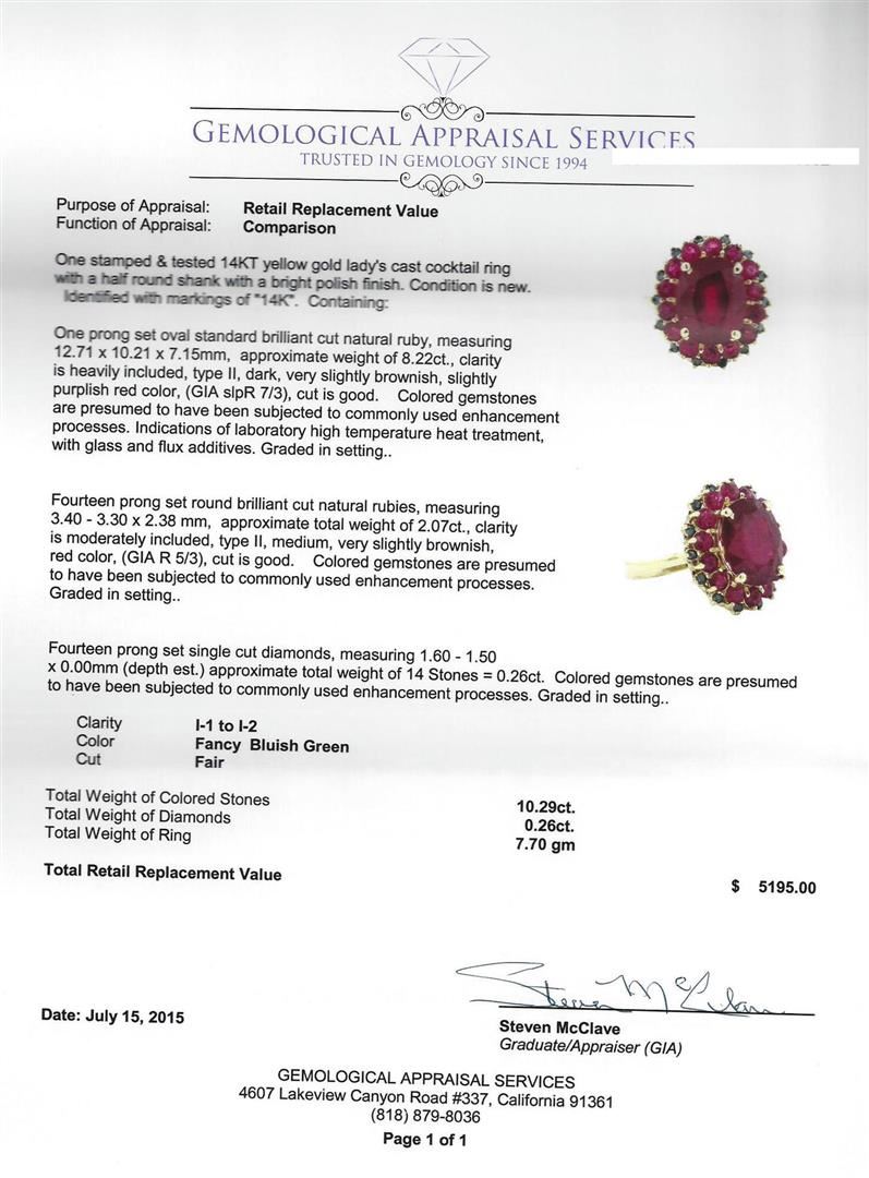 One stamped & tested 14KT yellow gold lady's cast cocktail ring with a half round shank with a bright polish finish. Condition is new. Identified with markings of "14K". Containing: One prong set oval standard brilliant cut natural ruby, measuring 12.71 x 10.21 x 7.15mm, approximate weight of 8.22ct., clarity is heavily included, type II, dark, very slightly brownish, slightly purplish red color, (GIA slpR 7/3), cut is good. Colored gemstones are presumed to have been subjected to commonly used enhancement processes. Indications of laboratory high temperature heat treatment, with glass and flux additives. Graded in setting. Fourteen prong set round brilliant cut natural rubies, measuring 3.40 - 3.30 x 2.38 mm, approximate total weight of 2.07ct., clarity is moderately included, type II, medium, very slightly brownish, red color, (GIA R 5/3), cut is good. Colored gemstones are presumed to have been subjected to commonly used enhancement processes. Graded in setting. Fourteen prong set single cut diamonds, measuring 1.60 - 1.50 x 0.00mm (depth est.) approximate total weight of 14 Stones = 0.26ct. Colored gemstones are presumed to have been subjected to commonly used enhancement processes. Graded in setting. Clarity: I-1 to I-2. Color: Fancy Bluish Green. Cut: Fair. Total Weight of Colored Stones: 10.29ct. Total Weight of Diamonds: 0.26ct. Total Weight of Ring: 7.70 gm. GAS Appraised at $5,195.00.