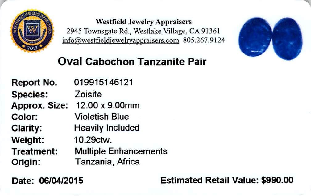 Two oval cabochon cut natural tanzanites, measuring 12.00 x 9.00 x 5.85mm, exact total weight 10.29ct., clarity is heavily included, type I, dark, moderately strong, violetish blue color, (GIA vB 7/4), cut is good. Transmitting light somewhat diffusel Westfield Appraised at $990.00.