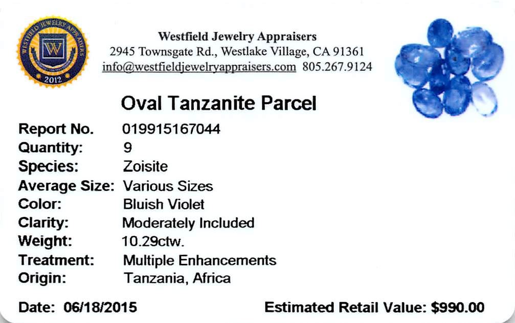 Nine oval mixed cut natural tanzanites exact total weight 10.29ct., clarity is moderately included, type I, medium dark, very slightly grayish, bluish violet color, (GIA bV 6/3), cut is good. Transmitting light with a minimum of distortion, transparent. Naturally occurring internal & external characteristics are present. Color grade is an average for the group. Tanzanite is a very rare gemstone that is only found in the country of Tanzania. Originally discovered in 1967. Tiffany & Company, named the stone Tanzanite. It is found in the Usumburu Mountains that border the Umba Valley of northern Tanzania. Tanzanite occurs in gray, brown, violet, blue, reddish-purple, & green. The gem is interesting because of its exceptional pleochroism. Rotated in different directions a tanzanite will exhibit multiple changes of color. Tanzanite has a low tolerance to ultrasonic cleaning, and should not be cleaned using this method. Westfield Appraised at $990.00.