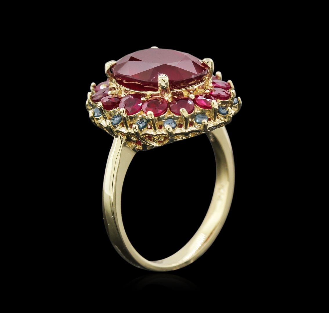 One stamped & tested 14KT yellow gold lady's cast cocktail ring with a half round shank with a bright polish finish. Condition is new. Identified with markings of "14K". Containing: One prong set oval standard brilliant cut natural ruby, measuring 12.71 x 10.21 x 7.15mm, approximate weight of 8.22ct., clarity is heavily included, type II, dark, very slightly brownish, slightly purplish red color, (GIA slpR 7/3), cut is good. Colored gemstones are presumed to have been subjected to commonly used enhancement processes. Indications of laboratory high temperature heat treatment, with glass and flux additives. Graded in setting. Fourteen prong set round brilliant cut natural rubies, measuring 3.40 - 3.30 x 2.38 mm, approximate total weight of 2.07ct., clarity is moderately included, type II, medium, very slightly brownish, red color, (GIA R 5/3), cut is good. Colored gemstones are presumed to have been subjected to commonly used enhancement processes. Graded in setting. Fourteen prong set single cut diamonds, measuring 1.60 - 1.50 x 0.00mm (depth est.) approximate total weight of 14 Stones = 0.26ct. Colored gemstones are presumed to have been subjected to commonly used enhancement processes. Graded in setting. Clarity: I-1 to I-2. Color: Fancy Bluish Green. Cut: Fair. Total Weight of Colored Stones: 10.29ct. Total Weight of Diamonds: 0.26ct. Total Weight of Ring: 7.70 gm. GAS Appraised at $5,195.00.
