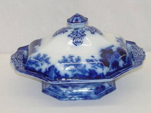 10 3/4" FLOW BLUE COVERED VEGETABLE - SCINDE PATTERN BY ALCOCK - SMALL CHIP BASE and PROFESSIONAL REPAIR;