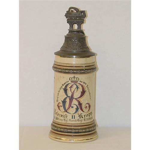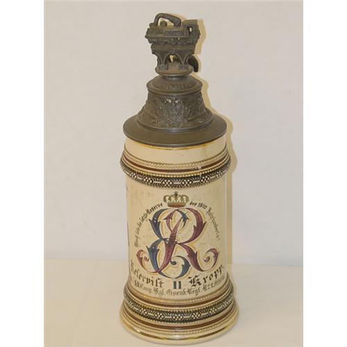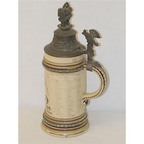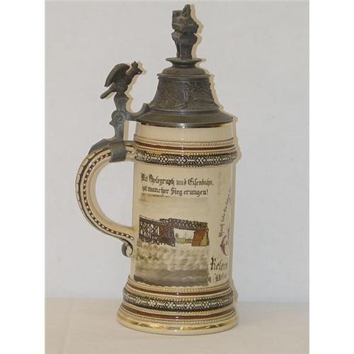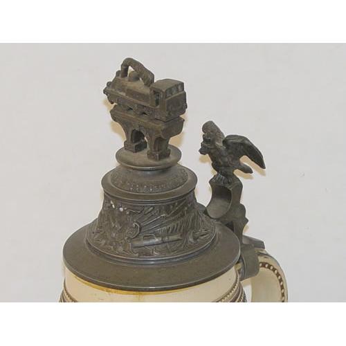 10 3/4" GERMAN INDUSTRIAL TRAINSMEN POTTERY STEIN- IMPERIAL CROWN CREST W/ E.R. 1898-1900 W/ FIGURAL PEWTER LID - WEAR & LOSSES TO DECORATION, CRAZING LINES