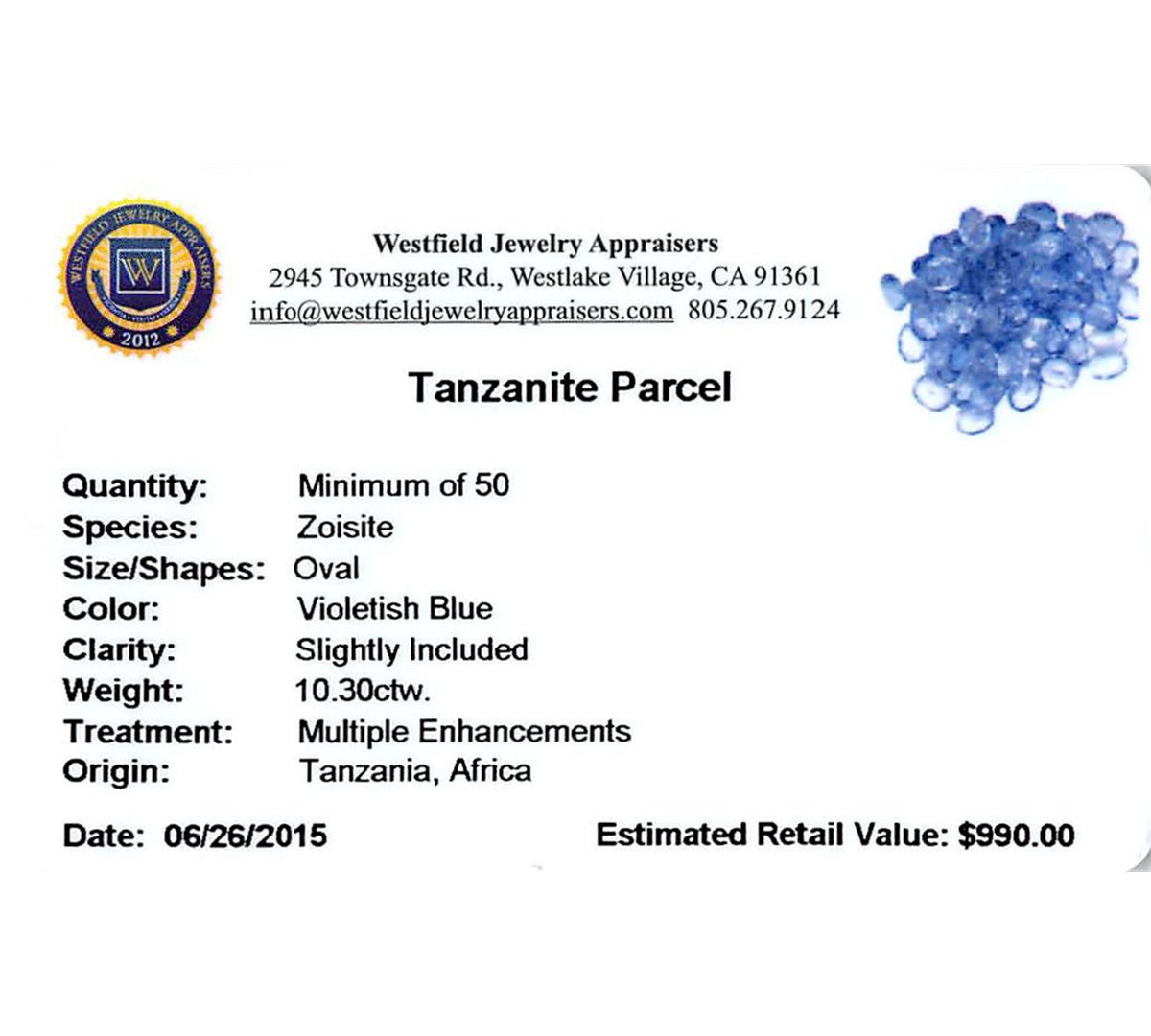 Fifty oval mixed cut natural tanzanites, measuring 4.00 x 3.00 x 1.95mm, exact total weight 10.30ct., clarity is slightly included, type I, medium, very slightly grayish, violetish blue color, (GIA vB 5/3), cut is good. Measurements & the color grade are an average for the group, Color grade is an average for the group, Transmitting light with no distortion, transparent, Naturally occurring internal & external characteristics are present, Indications of multiple laboratory enhancements, including high temperature heat treatment. Westfield Appraised at $990.00.