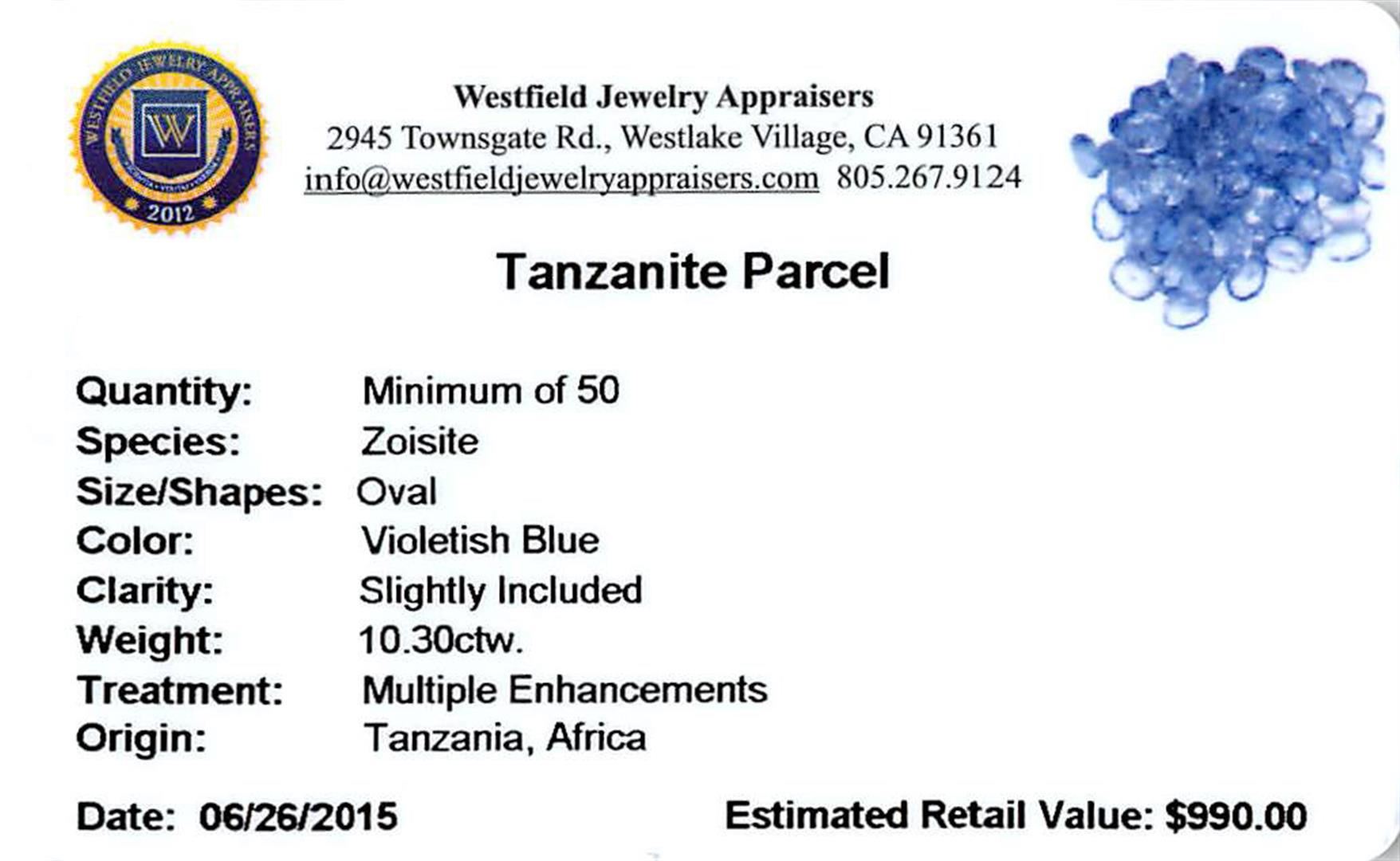 Fifty oval mixed cut natural tanzanites, measuring 4.00 x 3.00 x 1.95mm, exact total weight 10.30ct., clarity is slightly included, type I, medium, very slightly grayish, violetish blue color, (GIA vB 5/3), cut is good. Measurements & the color grade are an average for the group, Color grade is an average for the group, Transmitting light with no distortion, transparent, Naturally occurring internal & external characteristics are present, Indications of multiple laboratory enhancements, including high temperature heat treatment. Westfield Appraised at $990.00.