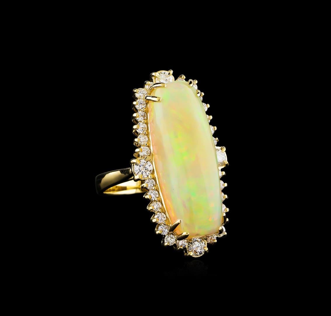 One electronically tested 14KT yellow gold ladies cast opal and diamond ring with a bright polish finish. The featured opal is set within a stylized diamond bezel, completed by a two and one-half millimeter wide band. Identified with markings of "K14". Condition is new, good workmanship. Containing: One semi crystal opal that is cut in a rectangular cus shaped cabochon and is prong set, measuring 25.50 mm long x 9.50 mm wide, and 6.75 mm thick and the approximate weight is 10.30 carats. The opal has a bright, multicolor play of color (fire) in a flashfire pattern; a high dome; a good cut; no inclusions; consistent in its brightness and pattern; and is slightly directional. Graded in the setting. Four prong set round brilliant cut diamonds, measuring 3.10 - 3.00 x 1.83mm (depth est.) approximate total weight of 4 Stones = 0.51ct. Graded in the setting. Clarity: I-1 to I-2. Color: G - H Twenty-Eight prong set round brilliant cut diamonds, measuring 1.60 - 1.50 x 0.93mm (depth est.) approximate total weight of 28 Stones = 0.48ct. Graded in the setting. Clarity: SI-2 to I-1. Color: G - I. Total Weight of Diamonds 0.99ct. Total Weight of Opals 10.30ct. Total Weight of Ring 10.46gm. AIG Appraised at $7,855.00.