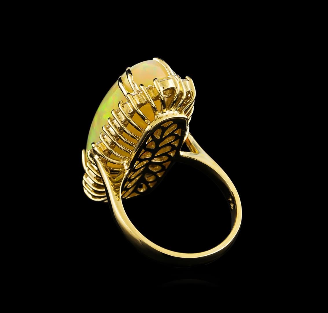 One electronically tested 14KT yellow gold ladies cast opal and diamond ring with a bright polish finish. The featured opal is set within a stylized diamond bezel, completed by a two and one-half millimeter wide band. Identified with markings of "K14". Condition is new, good workmanship. Containing: One semi crystal opal that is cut in a rectangular cus shaped cabochon and is prong set, measuring 25.50 mm long x 9.50 mm wide, and 6.75 mm thick and the approximate weight is 10.30 carats. The opal has a bright, multicolor play of color (fire) in a flashfire pattern; a high dome; a good cut; no inclusions; consistent in its brightness and pattern; and is slightly directional. Graded in the setting. Four prong set round brilliant cut diamonds, measuring 3.10 - 3.00 x 1.83mm (depth est.) approximate total weight of 4 Stones = 0.51ct. Graded in the setting. Clarity: I-1 to I-2. Color: G - H Twenty-Eight prong set round brilliant cut diamonds, measuring 1.60 - 1.50 x 0.93mm (depth est.) approximate total weight of 28 Stones = 0.48ct. Graded in the setting. Clarity: SI-2 to I-1. Color: G - I. Total Weight of Diamonds 0.99ct. Total Weight of Opals 10.30ct. Total Weight of Ring 10.46gm. AIG Appraised at $7,855.00.