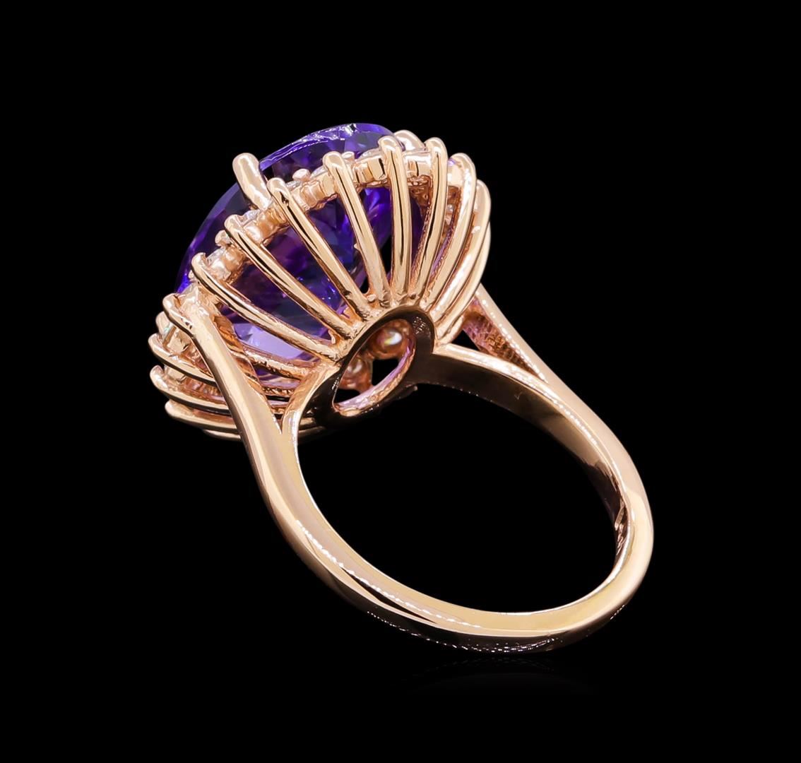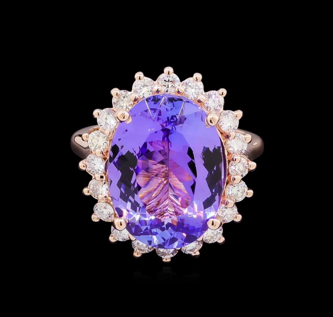 One electronically tested 14KT rose gold lady's cast fashion ring with a basket halo with a bright polish finish. The featured lady's ring has a shank measuring 2.03 millimeters wide. Identified with markings of "14K". Condition is new, good workmanship. Containing: One prong set oval modified brilliant cut natural tanzanite, measuring 16.63 x 12.25 x 7.06mm, 2%. bulge factor, approximate weight of 10.30ct., clarity is eye clean, type I, medium, moderately strong, bluish violet color, (GIA bV 5/4), cut is very good. Transmitting light with no distortion, transparent. Colored gemstones are presumed to have been subjected to commonly used enhancement processes. Graded in the setting. Twenty prong set round brilliant cut diamonds, measuring 2.40 - 2.30 x 1.43mm (depth est.) approximate total weight of 20 Stones = 0.96ct. Graded in the setting. Clarity: VS-2 to SI-2. Color: G - Good. Total Weight of Colored Stones 10.30ct. Total Weight of Diamonds 0.96ct. Total Weight of Ring 8.30gm. GAS Appraised at $20,530.00.