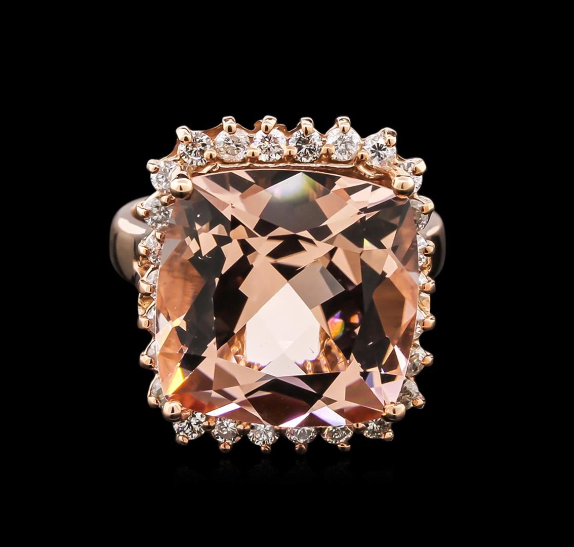 One electronically tested 14KT rose gold lady's cast fashion ring with a basket halo with a bright polish finish. The featured lady's ring has a shank measuring 2.94 millimeters wide. Identified with markings of "14K". Condition is new, good workmanship. Containing: One prong set square cushion modified brilliant cut natural morganite, measuring 14.16 x 14.15 x 8.66mm, approximate weight of 10.31ct., clarity is eye clean, type I, light, very slightly brownish, reddish orange color, (GIA rO 3/3), cut is very good. Transmitting light with no distortion, transparent. Colored gemstones are presumed to have been subjected to commonly used enhancement processes. Graded in the setting. Twenty-Six prong set round brilliant cut diamonds, measuring 2.00 - 1.90 x 1.23mm (depth est.) approximate total weight of 26 Stones = 0.74ct. Graded in the setting. Clarity: SI-2 to I-1. Color: I - Good. Total Weight of Colored Stones 10.31ct. Total Weight of Diamonds 0.74ct. Total Weight of Ring 8.30gm. GAS Appraised at $5,900.00.