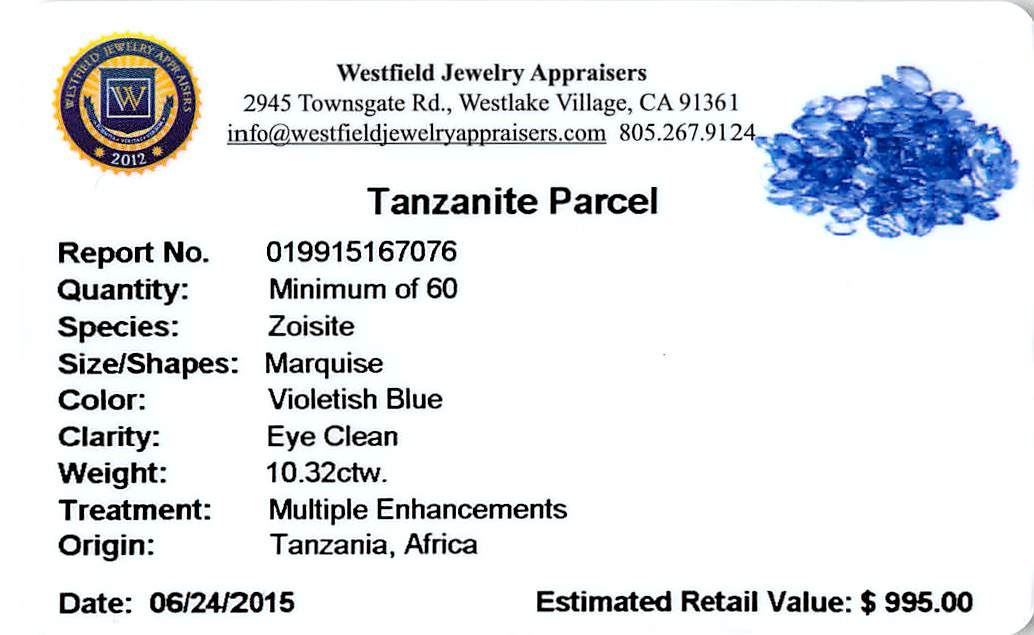 Sixty marquise mixed cut natural tanzanites, measuring 4.00 x 3.00 x 2.00mm, exact total weight 10.32ct., clarity is slightly included, type I, medium dark, very slightly grayish, violetish blue color, (GIA vB 6/3), cut is good. Measurements & the color grade are an average for the group, Color grade is an average for the group, Transmitting light with no distortion, transparent, Naturally occurring internal & external characteristics are present, Indications of multiple laboratory enhancements, including high temperature heat treatment. Westfield Appraised at $995.00.