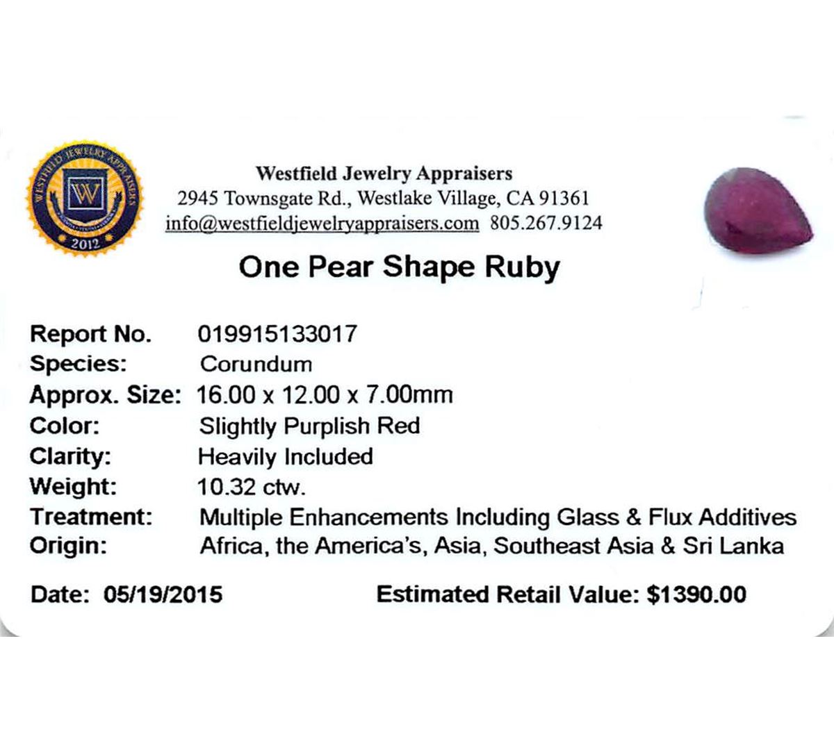 One pear mixed cut natural ruby, measuring 16.00 x 12.00 x 7.00mm, exact weight 10.32ct., clarity is heavily included, type II, medium dark, very slightly brownish, slightly purplish red color, (GIA slpR 6/3), cut is good. Westfield Appraised at $1,390.00.