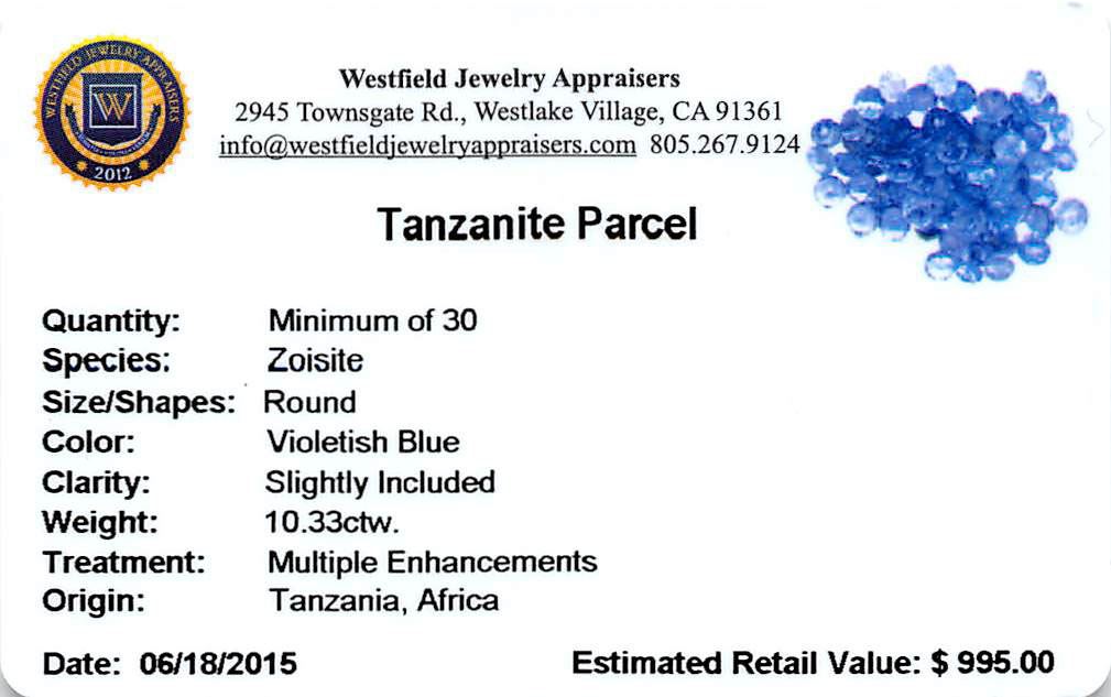 Thirty round mixed cut natural tanzanites exact total weight 10.33ct., clarity is slightly included, type I, medium dark, very slightly grayish, violetish blue color, (GIA vB 6/3), cut is good. Measurements & the color grade are an average for the group, Color grade is an average for the group, Naturally occurring internal & external characteristics are present, Indications of laboratory high temperature heat treatment. Westfield Appraised at $995.00.