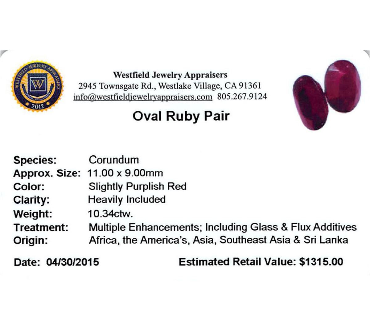 Two oval mixed cut natural rubies exact total weight 10.34ct., clarity is heavily included, type II, dark, very slightly brownish, slightly purplish red color, (GIA slpR 7/3), cut is good. Westfield Appraised at $1,315.00.