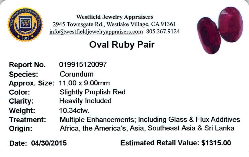 Two oval mixed cut natural rubies exact total weight 10.34ct., clarity is heavily included, type II, dark, very slightly brownish, slightly purplish red color, (GIA slpR 7/3), cut is good. Westfield Appraised at $1,315.00.
